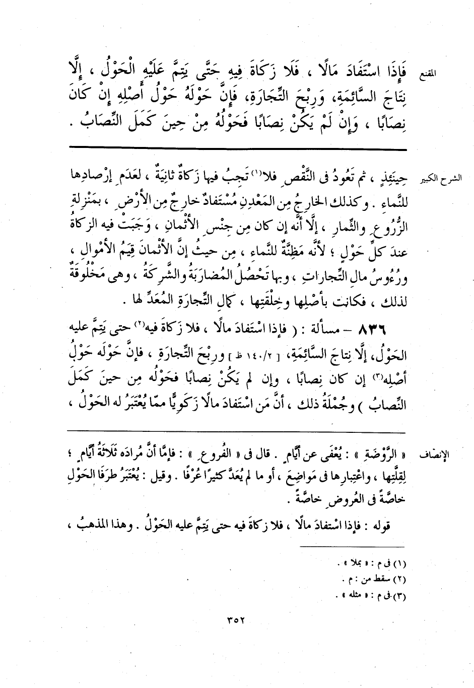 فَإِذَا اسْتَفَادَ مَالًا، فَلَا زَكَاةَ فِيهِ حَتَّى يَتِمَّ عَلَيْهِ الْحَوْلُ، إِلَّا نِتَاجَ السَّائِمَةِ، وَرِبْحَ التِّجَارَةِ، فَإِنَّ حَوْلَهُ حَوْلُ أصْلِهِ إِنْ كَانَ نِصَابًا، وَإِنْ لَمْ يَكنْ نِصَابًا فَحَوْلُهُ مِنْ حِينَ كَمَلَ النِّصَابُ.