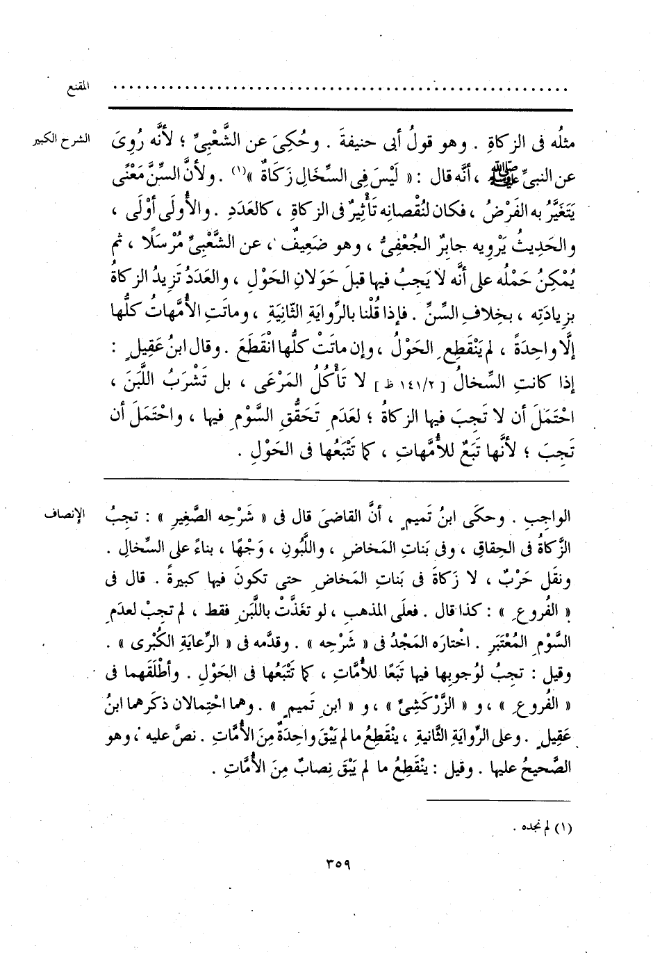 الواجِبِ. وحكَى ابنُ تَميمٍ، أنَّ القاضىَ قال فى «شَرْحِه الصَّغِيرِ»: تجِبُ الزَّكاةُ فى الحِقاقِ، وفى بَناتِ المَخاضِ، واللَّبُونِ، وَجْهًا، بناءً على السِّخالِ. ونقَل حَرْبٌ، لا زَكاةَ فى بَناتِ المَخاضِ حتى تكونَ فيها كبيرةً. قال فى «الفُروعِ»: كذا قال. فعلَى المذهبِ، لو تغَذَّتْ باللَّبَنِ فقط، لم تجِبْ لعدَمِ السَّوْمِ المُعْتَبَرِ. اخْتارَه المَجْدُ فى «شَرْحِه». وقدَّمه فى «الرِّعايَةِ الكُبْرى». وقيل: تجِبُ لوُجوبِها فيها تَبَعًا للأُمَّاتِ، كما تَتْبَعُها فى الحَوْلِ. وأطْلَقَهما في «الفُروعِ»، و «الزَّرْكَشِيِّ»، و «ابنِ تَميمٍ». وهما احْتِمالان ذكَرهما ابنُ عَقِيل. وعلى الرِّوايَةِ الثانيةِ، ينْقَطِعُ ما لم يَبْقَ واحِدَةٌ مِنَ الأُمَّاتِ. نصَّ عليه، وهو الصَّحيحُ عليها. وقيل: ينْقَطِعُ ما لم يَبْقَ نِصابٌ مِنَ الأُمَّاتِ.