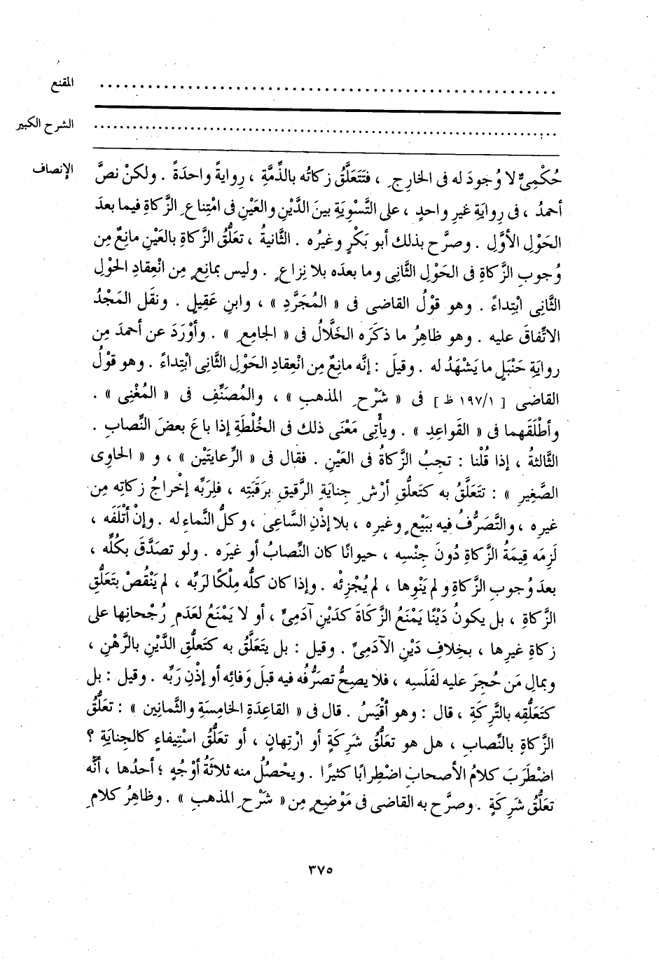 حُكْمِىٌّ لا وُجودَ له فى الخارِجِ، فتَتَعَلَّقُ زكاتُه بالذِّمَّةِ، رِوايةً واحدَةً. ولكنْ نصَّ أحمدُ، فى رِوايَة غيرِ واحدٍ، على التَّسْوِيَةِ بينَ الدَّيْنِ والعَيْنِ فى امْتِناعِ الزَّكاةِ فيما بعدَ الحَوْلِ الأوَّلِ. وصرَّح بذلك أبو بَكْرٍ وغيرُه. الثَّانيةُ، تعَلقُ الزَّكاةِ بالعَيْنِ مانِعٌ مِن وُجوبِ الزَّكاةِ فى الحَوْلِ الثَّانِى وما بعدَه بلا نِزاعٍ. وليس بمانِعٍ مِن انْعِقادِ الحوْلِ الثَّانِى ابْتِداءً. وهو قوْلُ القاضى فى «المُجَرَّدِ»، وابنِ عَقِيلٍ. ونقَل المَجْدُ الاتِّفاقَ عليه. وهو ظاهِرُ ما ذكَرَه الخَلَّالُ فى «الجامِع». وأوْرَدَ عن أحمدَ مِن روايَةِ حَنْبَلٍ ما يَشْهَدُ له. وقيلَ: إنَّه مانِعٌ مِن انْعِقادِ الحَوْلِ الثَّانِى ابْتِداءً. وهو قوْلُ القاضى فى «شَرْحِ المذهبِ»، والمُصَنِّفِ فى «المُغْنِى». وأطْلَقَهما فى «القَواعِدِ». ويأتِى مَعْنَى ذلك فى الخُلْطَةِ إذا باعَ بعضَ النِّصابِ. الثَّالثةُ، إذا قُلْنا: تجِبُ الزَّكاةُ فى العَيْنِ. فقال فى «الرِّعايتَيْن»، و «الحاوِى الصَّغِيرِ»: تتَعَلَّقُ به كتَعلُّقِ أرْشِ جِنايَةِ الرَّقيقِ. برَقَبَتِه، فلِرَبِّه إخْراجُ زكاتِه مِن غيرِه، والتَّصَرُّفُ فيه ببَيْع وغيرِه، بلا إذْنِ السَّاعِى، وكلُّ النَّماءِ له. وإنْ أتْلَفَه، لَزِمَه قِيمَةُ الزَّكاةِ دُونَ جِنْسِه، حيوانًا كان النِّصابُ أو غيرَه. ولو تصَدَّقَ بكُلِّه، بعدَ وُجوبِ الزَّكاةِ ولم يَنْوِها، لم يُجْزِئْه. وإذا كان كلُّه مِلْكًا لرَّبِّه، لم يَنْقُصْ بتَعَلُّقِ الزَّكاةِ، بل يكونُ دَيْنًا يَمْنَعُ الزَّكَاةَ كدَيْنِ آدَمِىٍّ، أو لا يَمْنَعُ لعَدَمِ رُجْحانِها على زكاةِ غيرِها، بخِلافِ دَيْنِ الآدَمِيِّ. وقيل: بل يتَعَلَّقُ به كتَعلُّقِ الدَّيْنِ بالرَّهْنِ، وبمالِ مَن حُجِرَ عليه لفَلَسِه، فلا يصِحُّ تصَرُّفُه فيه قبلَ وَفائِه أو إذْنِ رَبِّه. وقيل: بل كتَعَلُّقِه بالتَّرِكَةِ، قال: وهو أقْيَسُ. قال فى «القاعِدَةِ الخامِسَةِ والثَّمانِين»: تعَلُّقُ الزَّكاةِ بالنِّصابِ، هل هو تعَلُّقُ شَرِكَةٍ أو ارْتِهانٍ، أو تعَلُّقُ اسْتِيفاءٍ كالجِنايَةِ؟ اضْطربَ كلامُ الأصحاب اضْطِرابًا كثيرًا. ويحْصُلُ منه ثلاَثَةُ أوْجُهٍ؛ أحدُها، أنَّه تعَلُّقُ شَرِكَةٍ. وصرَّح به القاضى فى مَوْضِعٍ مِن «شَرْحِ المذهبِ». وظاهِرُ كلامِ