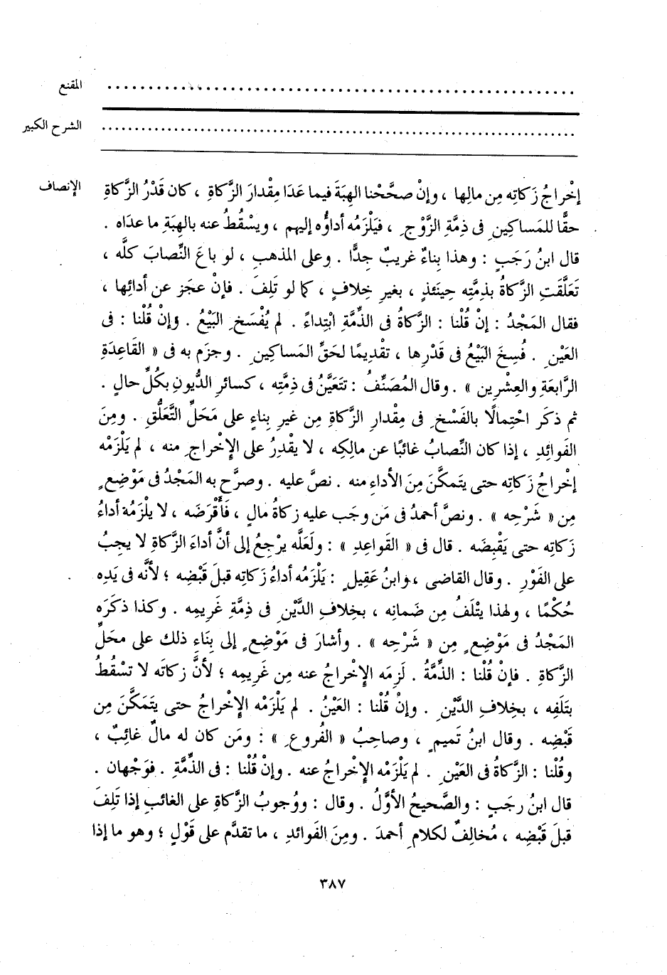 إخْراجُ زَكاتِه مِن مالِها، وإنْ صحَّحْنا الهِبَةَ فيما عَدَا مِقْدارَ الزَّكاةِ، كان قَدْرُ الزَّكاةِ حقًّا للمَساكِينِ فى ذِمَّةِ الزَّوْجِ، فيَلْزَمُه أداؤُه إليهم، ويسْقُطُ عنه بالهِبَةِ ما عدَاه قال ابنُ رَجَبٍ: وهذا بِناءٌ غريبٌ جِدًّا. وعلى المذهبِ، لو باعَ النِّصابَ كلَّه، تَعَلَّقَتِ الزَّكاةُ بذِمَّتِه حِينَئذٍ، بغيرِ خِلافٍ، كما لو تَلِفَ. فإنْ عجَز عن أدائِها، فقال المَجْدُ: إنْ قُلْنا: الزَّكاةُ فى الذِّمَّةِ ابْتِداءً. لم يُفْسَخِ البَيْعُ. وإنْ قُلْنا: فى العَيْنِ. فُسِخَ البَيْعُ فى قَدْرِها، تقْدِيمًا لحَقِّ المَساكِينِ. وجزَم به فى «القَاعِدَةِ الرَّابعَةِ والعِشْرِين». وقال المُصَنِّفُ: تتَعَيَّنُ فى ذِمَّتِه، كسائرِ الدُّيونِ بكُل حالٍ ثم ذكَر احْتِمالًا بالفَسْخِ فى مِقْدارِ الزَّكاةِ مِن غيرِ بِناءٍ على مَحَلِّ التَّعَلُّقِ. ومِنَ الفَوائِدِ، إذا كان النِّصابُ غائبًا عن مالِكِه، لا يقْدِرُ على الإخْراجِ منه، لم يَلْزَمْه إخْراجُ زَكاتِه حتى يتَمكَّنَ مِنَ الأداءِ منه. نصَّ عليه. وصرَّح به المَجْدُ فى مَوْضِعٍ مِن «شَرْحِه». ونصَّ أحمدُ فى مَن وجَب عليه زكاةُ مالٍ، فَأَقْرَضَه، لا يلْزَمُهْ أداءُ زَكاتِه حتى يَقْبِضَه. قال فى «القَواعِدِ»: ولَعَلَّه يرْجِعُ إلى أنَّ أداءَ الزَّكاةِ لا يجِبُ على الفَوْرِ. وقال القاضى، وابنُ عَقِيلٍ: يَلْزَمُه أداَءُ زَكاتِه قبلَ قَبْضِه؛ لأنَّه فى يَدِه حُكْمًا، ولهذا يتْلَفُ مِن ضَمانِه، بخِلافِ الدَّيْنِ فى ذِمَّةِ غَرِيمِه. وكذا ذكَرَه المَجْدُ فى مَوْضِع مِن «شَرْحِه». وأشارَ فى مَوْضِع إلى بِنَاء ذلك على محَلِّ الزَّكاةِ. فإنْ قُلْنا: الذِّمَّةُ. لَزِمَه الإِخْراجُ عنه مِن غَرِيمِه؛ لأنًّ زكاتَه لا تسْقُطُ بتَلَفِه، بخِلافِ الدَّيْنِ. وإنْ قُلْنا: العَيْنُ. لم يَلْزَمْه الإخْراجُ حتى يتَمَكَّنَ مِن قَبْضِه. وقال ابنُ تَميمٍ، وصاحِبُ «الفُروعِ»: ومَن كان له مالٌ غائِبٌ، وقُلْنا: الزَّكاةُ فى العَيْنِ. لم يَلْزَمْه الإخْراجُ عنه. وإنْ قُلْنا: فى الذِّمَّةِ. فوَجْهان. قال ابنُ رجَبٍ: والصَّحيحُ الأوَّلُ. وقال: ووُجوبُ الزَّكاةِ على الغائبِ إذا تَلِفَ قبلَ قَبْضِه، مُخالِفٌ لكلامِ أحمدَ. ومِنَ الفَوائدِ، ما تقدَّم على قَوْلٍ؛ وهو ما إذا