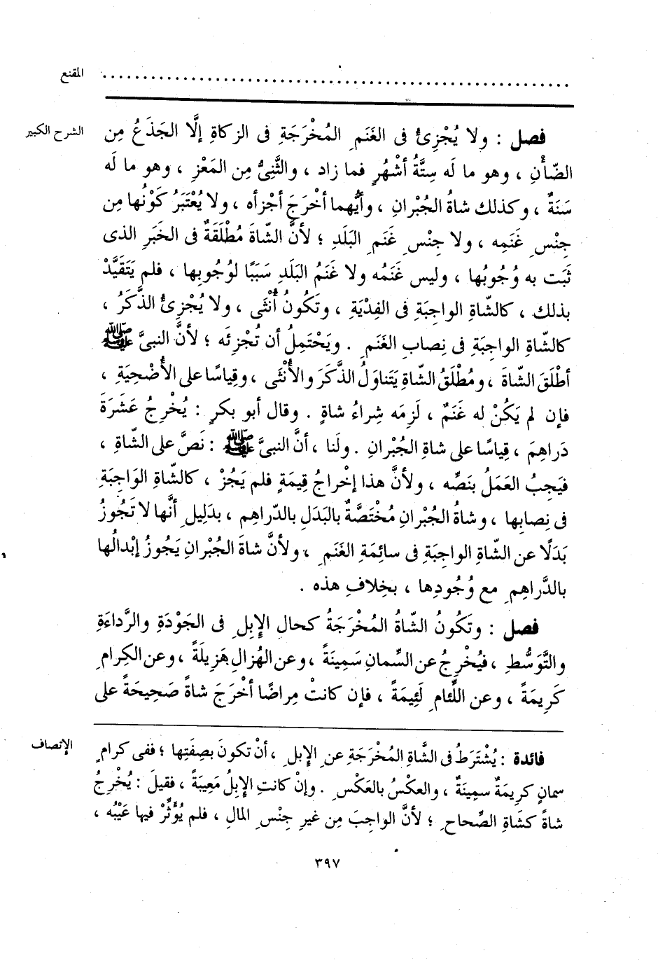 فائدة: يُشْتَرَطُ فى الشَّاةِ المُخْرَجَةِ عنِ الإِبلِ، أنْ تكونَ بصِفَتِها؛ ففى كرامٍ سمانٍ كرِيمَةٌ سمِينَةٌ، والعكْسُ بالعَكْسِ. وإنْ كانتِ الإِبِلُ مَعِيبَةً، فقيلَ: يُخْرِجُ شاةً كشَاةِ الصِّحاحِ، لأنَّ الواجِبَ مِن غيرِ جِنْسِ المالِ، فلم يُؤَثِّرْ فيها عَيْبُه،