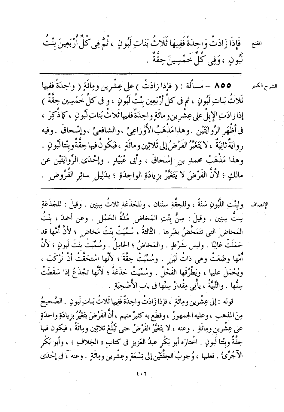 قوله: إلى عِشْرين ومِائَةٍ، فإذا زَادَتْ واحِدَةً فَفِيها ثَلاثُ بَناتِ لَبونٍ. الصَّحيحُ مِنَ المذهبِ، وعليه الجمهورُ، وقطَع به كثرٌ منهم، أنَّ الفَرْضَ يتَغَيَّرُ بزِيادَةِ واحدَةٍ على عِشرين ومِائَةٍ. وعنه، لا يتَغَيَّرُ الفَرْضُ حتى تَبْلُغَ ثلاِثين ومِائَة، فيكون فيها حِقَّةٌ وبِنْتا لَبونٍ. اخْتارَه أبو بَكْرٍ عبدُ العَزيزِ في كتابِ «الخِلافِ»، وأبو بَكْرٍ الآجُرِّيُّ. فعليها، وُجوبُ الحِقَّتَيْن إلى تِسْعَةٍ وعِشْرين ومِائَةٍ. وعنه، في إحْدَى