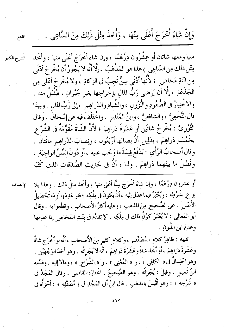 أو عشرون دِرْهَمًا، وإن شاءَ أخْرَجَ سِنًّا أعْلى منها، وأخَذ مثلَ ذلك. وهذا بلا نِزاعٍ بشَرْطِه، ويُعْتَبَرُ فيما عدَل إليه، أنْ يكونَ في مِلْكِه؛ فلو عَدِمَها لَزِمَه تَحْصيلُ الأصْلِ. على الصَّحيحِ مِنَ المذهبِ، وعليه أكثرُ الأصحابِ، وقطَعوا به. وقال أبو المَعالِى: لا يُعْتَبَرُ كوْنُ ذلك في مِلْكِه. كما تقدَّم في بِنْتِ المَخاضِ إذا عَدِمَها وعدِمَ ابنَ اللَّبونِ.