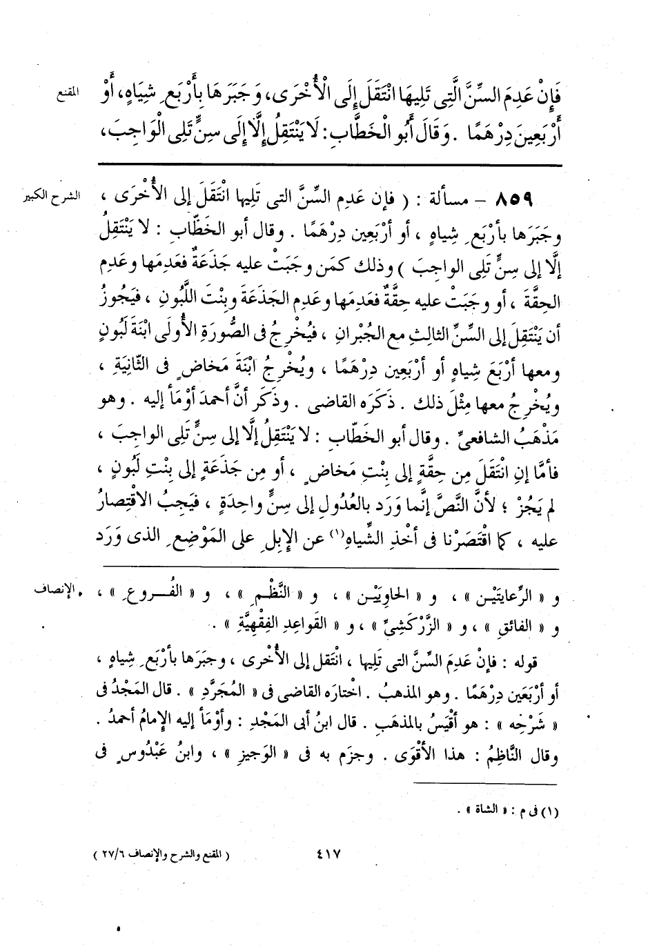 قوله: فإنْ عَدِمَ السِّنَّ التى تَلِيها، انْتَقل إلى الأُخْرى، وجبَرَها بأرْبَعِ شِياهٍ، أو أرْبَعَين دِرْهَمًا. وهو المذهبُ. اخْتارَه القاضى في «المُجَرَّدِ». قال المَجْدُ في «شَرْحِه»: هو أقْيَسُ بالمذهَبِ. قال ابنُ أبى المَجْدِ: وأوْمَأ إليه الإِمامُ أحمدُ. وقال النَّاظِمُ: هذا الأقْوَى. وجزَم به في «الوَجيزِ»، وابنُ عَبْدُوسٍ في