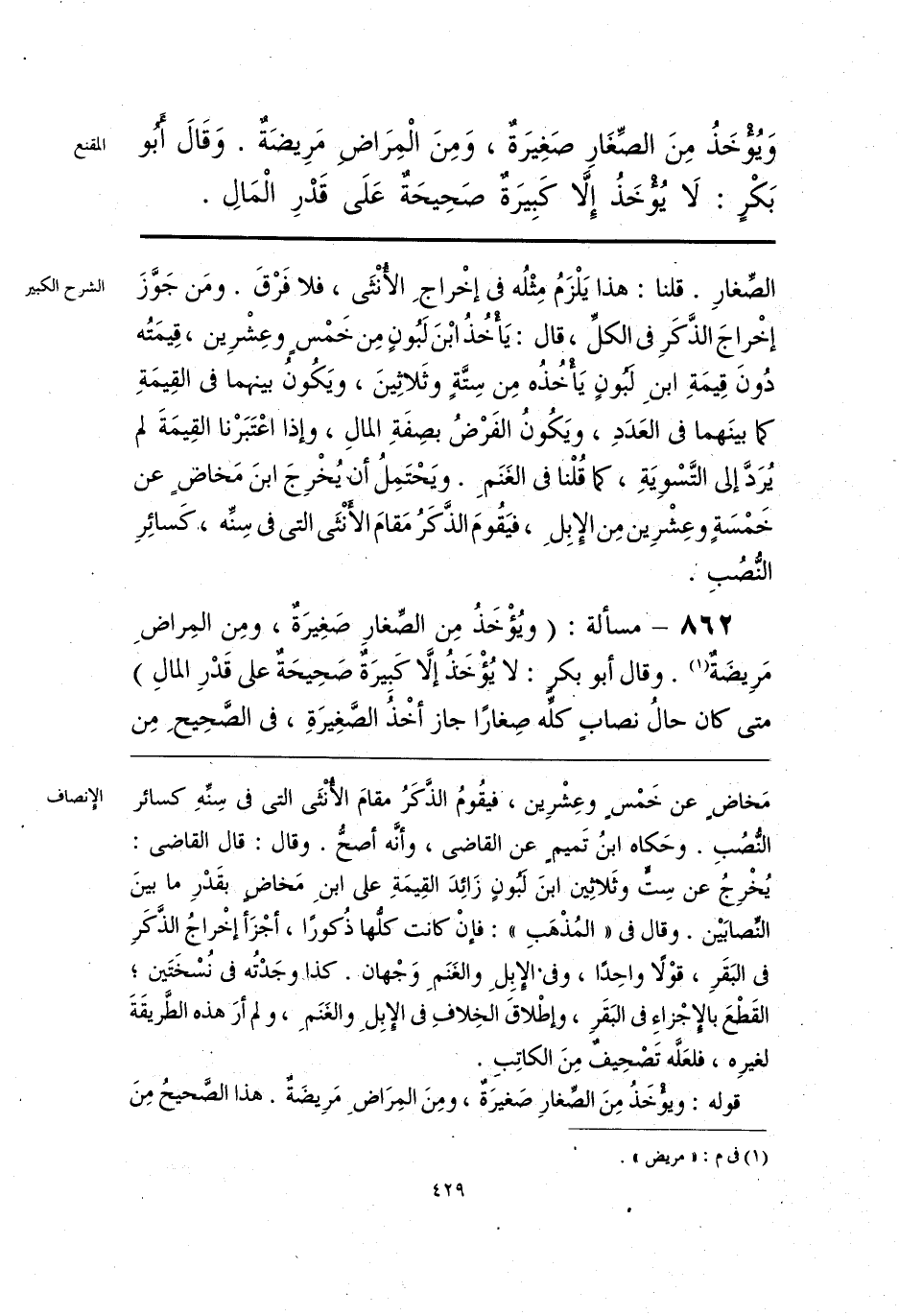 وَيُؤْخَذُ مِنَ الصِّغَارِ صَغِيرَةٌ، وَمِنَ الْمِرَاضِ مَرِيضَةٌ. وَقَالَ أَبُو بَكْرٍ: لَا يُؤْخَذُ إِلَّا كَبِيرَةٌ صَحِيحَةٌ عَلَى قَدْرِ الْمَالِ.