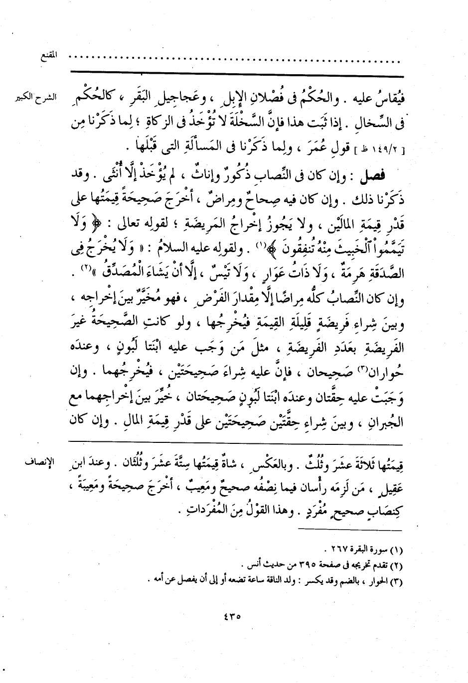 قِيمَتُها ثَلاثَةَ عشَرَ وثُلُثٌ. وبالعَكْسِ، شاةٌ قِيمَتُها سِتَّةَ عشَرَ وثُلُثَان. وعندَ ابنِ عَقِيلٍ، مَن لَزِمَه رأْسان فيما نِصْفُه صحيحً ومَعِيبٌ، أخْرَجَ صحِيحَةً ومَعِيبَةً، كِنصَابٍ صحيحٍ مُفْرَدٍ. وهذا القوْلُ مِنَ المُفْرَداتِ.
