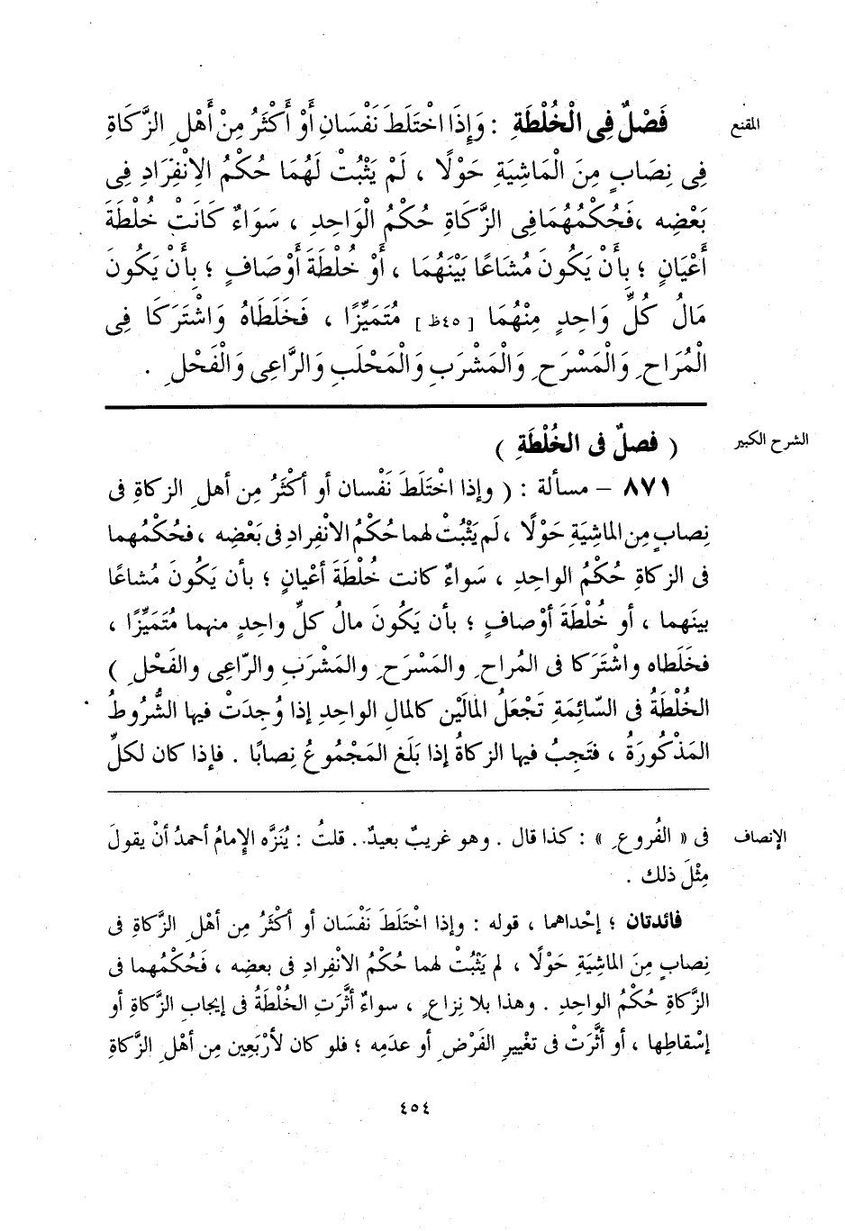 فَصْلٌ فِى الْخُلْطَةِ: وَإِذَا اخْتَلَطَ نَفْسَانِ أَوْ أَكْثَرُ مِنْ أَهْلِ الزَّكَاةِ فِى نِصَابٍ مِنَ الْمَاشِيَةِ حَوْلًا، لَمْ يَثْبُتْ لَهُمَا حُكْمُ الِانْفِرَادِ فِى بَعْضِه، فَحُكْمُهُمَا فِى الزَّكَاةِ حُكْمُ الْوَاحِدِ، سَوَاءٌ كَانَتْ خُلْطَةَ أَعْيَانٍ؛ بِأَنْ يَكُونَ مُشَاعًا بَيْنَهُمَا، أَوْ خُلْطَةَ أَوْصَافٍ؛ بِأَنْ يَكُونَ مَالُ كُلِّ وَاحِدٍ مِنْهُمَا مُتَمَيِّزًا، فَخَلَطَاهُ وَاشْتَرَكَا فِى الْمُرَاحِ وَالْمَسْرَحِ وَالْمَشْرَبِ وَالْمَحْلَبِ وَالرَّاعِى وَالْفَحْلِ.
