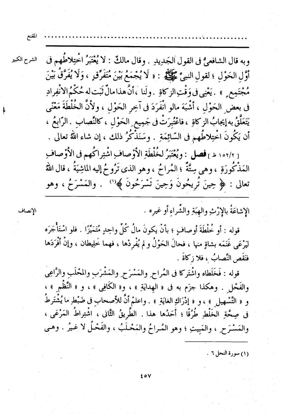 قوله: فَخَلَطاه واشْتَركا في المُراحِ والمَسْرَحِ والمَشْرَبِ والمحْلَبِ والرَّاعِى والفَحْلِ. وهكذا جزَم به في «الهِدايَةِ»، و «الكَافِى»، و «النَّظْمِ»، و «التَّسْهيلِ»، و «إدْرَاكِ الغايَةِ». واعلمْ أنَّ للأصحابِ في ضَبْطِ ما يُشْتَرطُ في صِحَّةِ الخَلْطِ طُرُقًا؛ أحَدُها هذا. الطَّرِيقُ الثَّاني، اشْتِراطُ المَرْعَى، والمَسْرَحِ، والمَبِيتِ؛ وهو المُراحُ والمَحْلَبُ، والفَحْلُ لا غيرُ. وهى