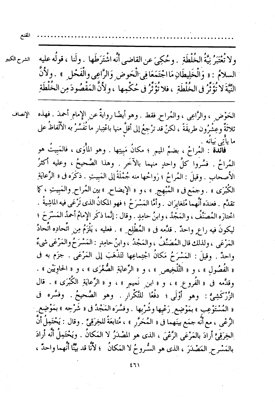 فائدة: المُراحُ، بضمِّ الميمِ؛ مكان مَبِيتِها. وهو المأْوَى، فالمَبِيتُ هو المُراحُ. فسَّروا كلَّ واحدٍ منهما بالآخَرِ. وهذا الصَّحيحُ، وعليه أكثرُ الأصحابِ. وقيلَ: المُراحُ؛ رَواحُها منه جُمْلَةً إلى المَبِيتِ. ذكَرَه فى «الرِّعايَةِ الكُبْرَى». وجمَع فى «المُبْهِجِ»، و «الإِيضاحِ» بين المُراحِ والمَبِيتِ، كما تقدَّم. فعندَه أنَّهما مُتَغايِرَان. وأمَّا المَسْرَحُ؛ فهو المكانُ الذى تَرْعَى فيه الماشِيةُ. اخْتارَه المُصَنِّفُ، والمَجْدُ، وابنُ حامِدٍ. وقال: إنَّما ذكَر الإِمامُ أحمدُ المَسْرَحَ؛ ليكونَ فيه راعٍ واحدٌ. قدَّمه فى «المُطْلِعِ». فعليه، يَلْزَمُ مِنِ اتحادِه اتِّحادُ المَرْعَى، ولذلك قال المُصَنِّفُ، والمَجْدُ، وابنُ حامِدٍ: المَسْرَحُ والمَرْعَى شئٌ واحدٌ. وقيلَ: المَسْرَحُ مَكانُ اجْتِماعِها لتَذْهَبَ إلى المَرْعَى. جزَم به فى «الفُصُولِ»، و «التَّلْخِيصِ»، و «الرِّعايَةِ الصُّغْرَى»، و «الحاوِيَيْن». وقدَّمه فى «الفُروعِ»، و «ابنِ نَميمٍ»، و «الرعايَةِ الكُبْرَى». قال الزَّرْكَشِىُّ: وهو أوْلَى؛ دفْعًا للتَّكْرارِ. وهو الصَّحيحُ. وفسَّره فى «المُسْتَوْعِب» بمَوْضِعِ رَعْيِها وشُرْبِها. وفسَّرَه المَجْدُ فى «شَرْحِه» بمَوْضِعِ. الرَّعْىِ، مع أنَّه جمَع بينَهما فى «المُحَررِ»، مُتابعَةً للخِرَقِىِّ. وقال: يَحْتَمِلُ أنَّ الخِرَقِىَّ أرادَ بالمَرْعَى الرَّعْىَ، الذى هو المصْدَرُ لا المَكانُ. ويَحْتَمِلُ أنَّه أرادَ بالمَسْرحِ المَصْدَرَ، الذى هو السُّروحُ لا المَكانُ؛ لأنَّا قد بيَّنَّا أنَّهما واحدٌ،