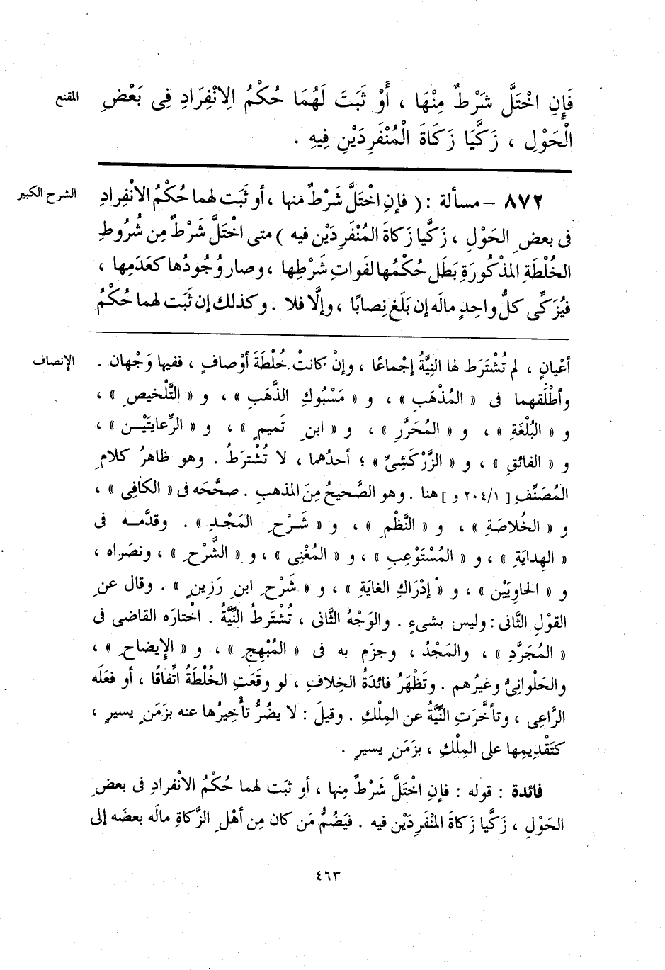 فائدة: قوله: فإنِ اخْتَلَّ شَرْطٌ مِنها، أو ثبَت لهما حُكْمُ الانْفرادِ فى بعضِ الحَوْلِ، زَكَّيا زَكاةَ المنْفَردَيْن فيه. فيَضُمُّ مَن كان مِن أهْلِ الزَّكاةِ مالَه بعضَه إلى