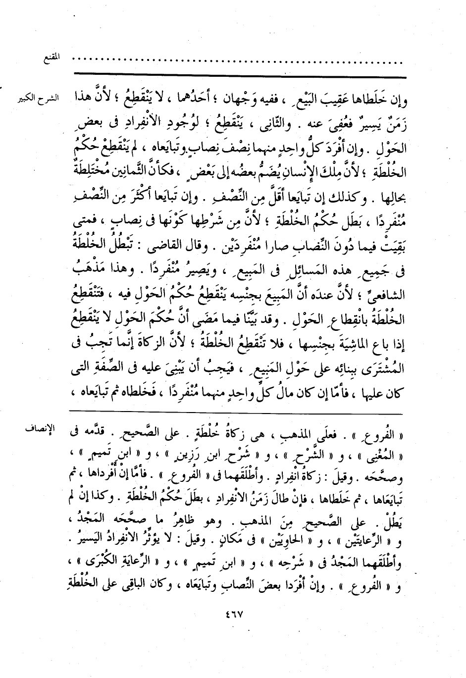 «الفروعِ». فعلَى المذهبِ، هى زكاة خُلْطَةٍ. على الصَّحيحِ. قدَّمه فى «المُغْنِى»، و «الشَّرْحِ»، و «شَرْحِ ابنِ رَزِينٍ»، و «ابن تَميمٍ»، وصحَّحَه. وقيلَ: زكاة انْفِرادٍ. وأطْلَقَهما فى «الفروعِ». فأمَّا إنْ أَفْرداها، ثم تَبايَعَاها، ثم خَلَطاها، فإنْ طالَ زَمَن الانْفِرادِ، بطَلَ حُكْمُ الخلْطَةِ. وكذا إنْ لم يَطلْ. على الصَّحيحِ مِنَ المذهب. وهو ظاهِرُ ما صحَّحَه المَجْدُ، و «الرِّعايتَيْن»، و «الحاوِيَيْن» فى مَكانٍ. وقيلَ: لا يؤثِّرُ الانْفِرادُ اليَسيرُ. وأطْلَقَهما المَجْدُ فى «شَرْحِه»، و «ابنَ تَميمٍ»، و «الرِّعايَةِ الكبْرَى»، و «الفُروعِ». وإنْ أفْرَدا بعضَ النِّصاب وتَبايَعَاه، وكان الباقِى على الخُلْطَةِ