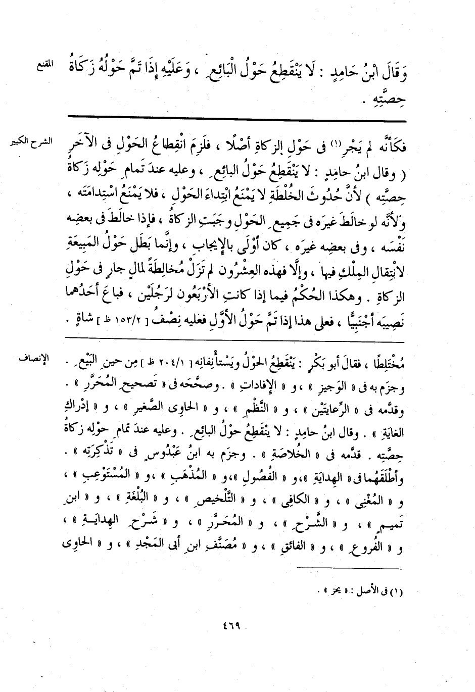 مُخْتَلِطًا، فقالَ أبو بَكْرٍ: يَنْقَطِعُ الحوْلُ ويَسْتأْنِفانِه مِن حينِ البَيْعِ. وجزَم به فى «الوَجيزِ»، و «الإِفاداتِ». وصحَّحَه فى «تَصحيحِ المُحَرَّرِ». وقدَّمه فى «الرِّعايتَيْن»، و «النَّظْمِ»، و «الحاوِى الصَّغيرِ»، و «إدْراكِ الغايَةِ». وقال ابنُ حامِدٍ: لا ينْقَطِعُ حوْلُ البائِعِ. وعليه عندَ تمامِ حوْلِه زكاةُ حِصَّتِه. قدَّمه فى «الخُلاصَةِ». وجزَم به ابنُ عَبْدُوسٍ فى «تَذْكِرَتِه». وأطْلَقَهُما فى «الهِدايَةِ»، و «الفُصُولِ»، و «المُذْهَبِ»، و «المُسْتَوْعِبِ»، و «المُغْنِى»، و «الكافِى»، و «التَّلْخيصِ»، و «البُلْغَةِ»، و «ابنِ تَميمٍ»، و «الشَّرْحِ»، و «المُحَرَّرِ»، و «شَرْحِ الهِدايَةِ»، و «الفُروعِ»، و «الفائقِ»، و «مُصَنَّفِ ابنِ أبى المَجْدِ»، و «الحاوِى