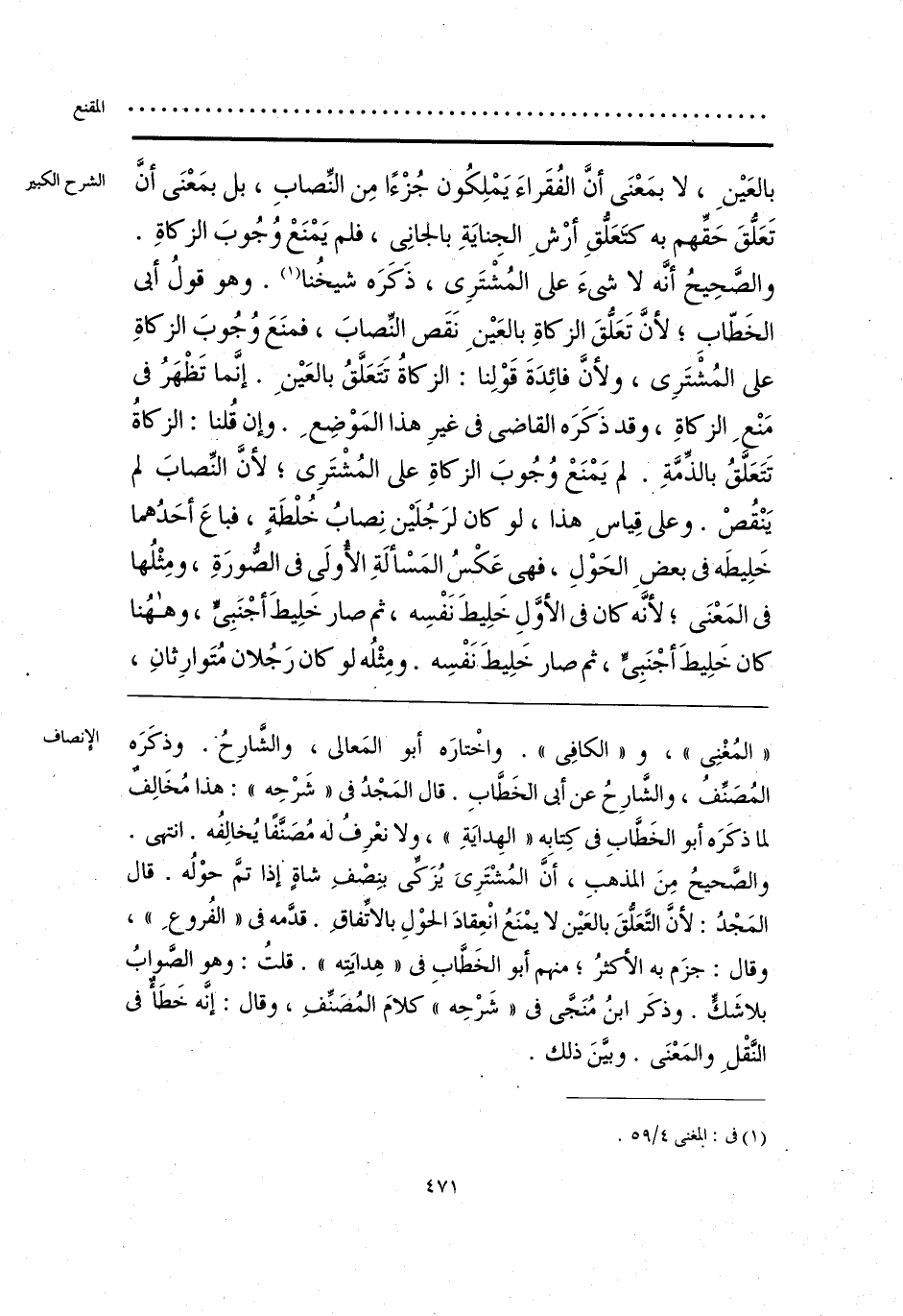 «المُغْنِى»، و «الكافِى». واخْتارَه أبو المَعالى، والشَّارِحُ. وذكَرَه المُصَنِّفُ، والشَّارِحُ عن أبى الخَطَّابِ. قال المَجْدُ فى «شَرْحِه»: هذا مُخَالِفٌ لما ذكَرَه أبو الخَطَّابِ فى كِتابِه «الهِدايَةِ»، ولا نعْرِفُ له مُصَنَّفًا يُخالِفُه. انتهى. والصَّحيحُ مِنَ المذهبِ، أنَّ المُشْتَرِىَ يُزَكِّى بنِصْفِ شاةٍ إذا تمَّ حوْلُه. قال المَجْدُ: لأنَّ التَّعَلُّقَ بالعَيْن لا يمْنَعُ انْعِقادَ الحوْلِ بالاتِّفاقِ. قدَّمه فى «الفُروعِ»، وقال: جزَم به الأكثرُ؛ منهم أبو الخَطَّابِ فى «هِدايَتِه». قلتُ: وهو الصَّوابُ بلا شَكٍّ. وذكَر ابنُ مُنَجَّى فى «شَرْحِه» كلامَ المُصَنِّفِ، وقال: إنَّه خَطَأٌ فى النَّقْلِ والمَعْنَى. وبيَّنَ ذلك.