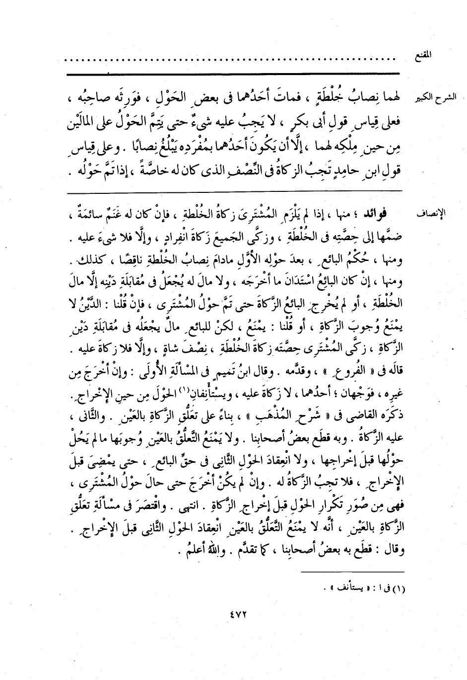 فوائد، منها، إذا لم يَلْزَمِ المُشْتَرِى زكاةُ الخُلْطةِ، فإنْ كان له غَنَمٌ سائمَةٌ، ضمَّها إلى حِصتِه فى الخُلْطَةِ، وزكَّى الجَميعَ زَكاةَ انْفِرادٍ، وإلَّا فلا شئَ عليه. ومنها، حُكْمُ البائعِ، بعدَ حوْلِه الأوَّلِ ما دامَ نِصابُ الخُلْطةِ ناقِصًا، كذلك. ومنها، إنْ كان البائِعُ اسْتَدَانَ ما أخْرَجَه، ولا مالَ له يُجْعَلُ فى مُقابَلَةِ دَيْنِه إلَّا مالَ الخُلْطَةِ، أو لم يُخْرِج البائعُ الزَّكاةَ حتى تَمَّ حوْلُ المُشْتَرِى، فإنْ قُلْنا: الدَّيْنُ لا يمْنَعُ وُجوبَ الزَّكاةِ، أو قُلْنا: يمْنَعُ، لكنْ للبائعِ مالٌ يجْعَلُه فى مُقابَلَةِ دَيْنِ الزَّكاةِ، زكَّى المُشْتَرِى حِصَّتَه زكاةَ الخُلْطَةِ، نِصْفَ شاةٍ، وإلَّا فلا زكاةَ عليه. قالَه فى «الفروعِ»، وقدَّمه. وقال ابنُ تَميمٍ فى المسْألَةِ الأُولَى: وإنْ أخْرَجَ مِن غيرِه، فوَجْهان؛ أحدُهما، لا زَكاةَ عليه، ويسْتأْنِفانِ (¬1) الحوْلَ مِن حينِ الإِخْراجِ. ذكَرَه القاضى فى «شَرْحِ المُذْهَبِ»، بِناءً على تعَلُّقِ الزَّكاةِ بالعَيْنِ. والثَّانى، عليه الزَّكاةُ. وبه قطَع بعضُ أصحابِنا. ولا يَمْنَعُ التَّعلُّقُ بالعَيْنِ وُجوبَها ما لم يَحُلْ حوْلُها قبلَ إخْراجِها، ولا انْعِقادَ الحوْلِ الثَّانِى فى حقِّ البائعِ، حتى يمْضِىَ قبلَ الإِخْراجِ، فلا تجِبُ الزَّكاةُ له. وإنْ لم يكُنْ أخْرَجَ حتى حالَ حوْلُ المُشْتَرِى، فهى مِن صُوَرِ تَكْرارِ الحوْلِ قبلَ إخْراجِ الزَّكاةِ. انتهى. واقْتصَرَ فى مسْألَةِ تعَلُّقِ الزَّكاةِ بالعَيْنِ، أنَّه لا يمْنَعُ التَّعَلُّقُ بالعَيْنِ انْعِقادَ الحوْلِ الثَّانِى قبلَ الإِخْراجِ.