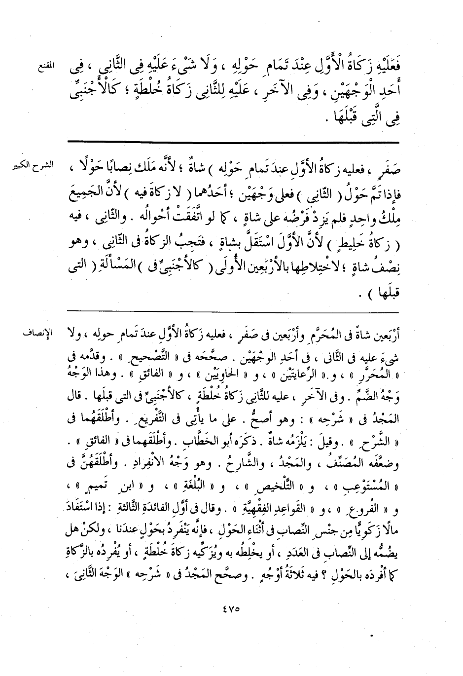 أرْبَعين شاةً فى المُحَرَّمِ وأرْبَعين فى صَفَرٍ، فعليه زَكاةُ الأوَّلِ عندَ تَمامِ حولِه، ولا شئَ عليه فى الثَّانى، فى أحَدِ الوجْهَيْن. صحَّحَه فى «التَّصْحيحِ». وقدَّمه فى «المُحَرَّرِ»، و «الرِّعايتَيْن»، و «الحاوِيَيْن»، و «الفائقِ». وهذا الوَجْهُ وَجْهُ الضَّمِّ. وفى الآخَرِ، عليه للثَّانِى زَكاةُ خُلْطَةٍ، كالأجْنَبِىِّ فى التى قبلَها. قال المَجْدُ فى «شَرْحِه»: وهو أصحُّ. على ما يأْتِى فى التَّفْريغِ. وأطْلَقَهُما فى «الشَّرْحِ». وقيلَ: يَلْزَمُه شاةٌ. ذكَرَه أبو الخَطَّابِ. وأطْلَقَهما فى «الفائقِ». وضعَّفَه المُصَنِّفُ، والمَجْدُ، والشَّارِحُ. وهو وَجْهُ الانْفِرادِ. وأطْلَقَهُنَّ فى «المُسْتَوْعِبِ»، و «التَّلْخيصِ»، و «البُلْغَةِ»، و «ابنِ تَميمٍ»، و «الفُروعِ»، و «القَواعِدِ الفِقْهِيَّةِ». وقال فى أوَّلِ الفائدَةِ الثَّالثةِ: إذا اسْتَفَادَ مالًا زَكَوِيًّا مِن جنْسِ النِّصابِ فى أثْنَاءِ الحَوْلِ، فإنَّه يَنْفرِدُ بحَوْلٍ عندَنا، ولكنْ هل يضُمُّه إلى النِّصابِ فى العَدَدِ، أو يخْلِطُه به ويُزَكِّيه زكاةَ خُلْطَةٍ، أو يُفْرِدُه بالزَّكاةِ كما أفْردَه بالحَوْلِ؟ فيه ثَلَاثةُ أوْجُهٍ. وصحَّح المَجْدُ فى «شَرْحِه» الوَجْهَ الثَّانِىَ،