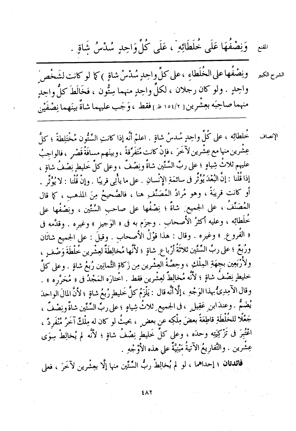 خُلطائِه، على كُلِّ واحِدٍ سُدسُ شاةٍ. اعلم أنَّه إذا كانتِ السِّتُّون مُخْتَلِطةً؛ كلُّ عِشْرين منها مع عِشْرين لآخَرَ، فإنْ كانت مُتَفرِّقةً، وبينَهم مسافَةُ قَصْرٍ، فالواجِبُ عليهم ثلاثُ شِياهٍ؛ على ربِّ السِّتِّين شاةٌ ونِصْفٌ، وعلى كلِّ خَليطٍ نِصْفُ شاةٍ، إذا قُلْنا: إنَّ البُعْدَ يُؤَثِّر فى سائمَةِ الإِنْسانِ. على ما يأْتِى قريبًا. وإنْ قُلْنا: لا يُؤَثِّر. أو كانت قرِيبَةً، وهو مُرادُ المُصَنِّفِ هنا، فالصَّحيحُ مِنَ المذهبِ، كما قال المُصَنِّفُ، على الجميعِ شاةٌ، نِصْفُها على صاحبِ السِّتِّين، ونِصْفُها على خُلَطائِه، وعليه أكثرُ الأصحابِ. وجزَم به فى «الوَجيزِ» وغيرِه. وقدَّمه فى «الفُروعِ» وغيرِه. وقال: هذا قوْلُ الأصحابِ. وقيلَ: على الجميع شاتَان ورُبعٌ، على ربِّ السِّتِّين ثلَاثَةُ أرْباعِ شاةٍ، لأنَّها مُخالِطَةٌ لعِشْرين خُلْطَةَ وَصْفٍ، ولأرْبَعِين بجِهَةِ المِلْكِ، وحِصَّةُ العِشْرين مِن زَكاةِ الثَّمانِين رُبعُ شاةٍ. وعلى كلِّ خليطٍ نِصْفُ شاةٍ؛ لأنَّه مُخالِطٌ لعِشْرين فقط. اخْتارَه المَجْدُ فى «مُحَرَّرِه». وقال الآمِدِىُّ بهذا الوَجْهِ، إلَّا أنَّه قال: يَلْزَمُ كلَّ خَليطٍ رُبعُ شاةٍ؛ لأنَّ المالَ الواحدَ يُضَمُّ. وعندَ ابنِ عَقِيلٍ، فى الجميعِ ثلاثُ شِياهٍ؛ على ربِّ السِّتين شاةٌ ونِصْفٌ، جَعْلًا للخُلْطَةِ قاطِعَةً بعضَ مِلْكِه عن بعض، بحيثُ لو كان له مِلْكٌ آخَرُ مُنْفَرِدٌ، اعْتُبِرَ فى تَزْكِيَتِه وحدَه، وعلى كلِّ خَليطٍ نِصْفُ شاةٍ؛ لأنَّه لم يُخالِطْ سِوَى عِشْرين. والتَّفارِيعُ الآتيةُ مَبْنِيَّةٌ على هذه الأوْجهِ.