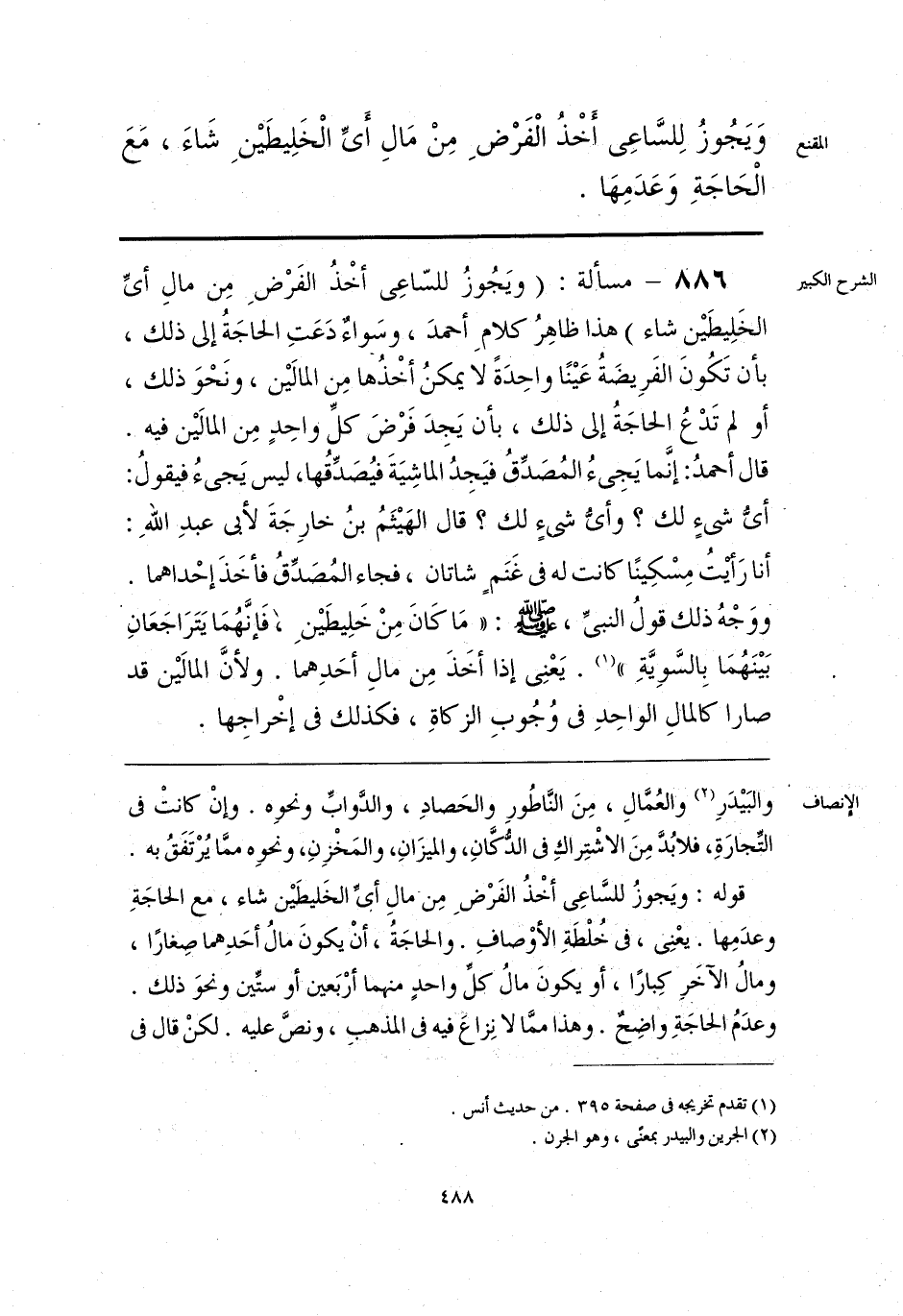 قوله: ويَجوزُ للسَّاعِى أخْذُ الفَرْضِ مِن مالِ أىِّ الخَليطَيْن شاء، مع الحاجَةِ وعدَمِها. يعْنِى، فى خُلْطَةِ الأوْصافِ. والحاجَةُ، أنْ يكونَ مالُ أحَدِهما صِغارًا، ومالُ الآخَرِ كِبارًا، أو يكونَ مالُ كل واحدٍ منهما أرْبَعين أو ستِّين ونحوَ ذلك. وعدَمُ الحاجَةِ واضِحٌ. وهذا ممَّا لا نِزاعَ فيه فى المذهبِ، ونصَّ عليه. لكنْ قال فى