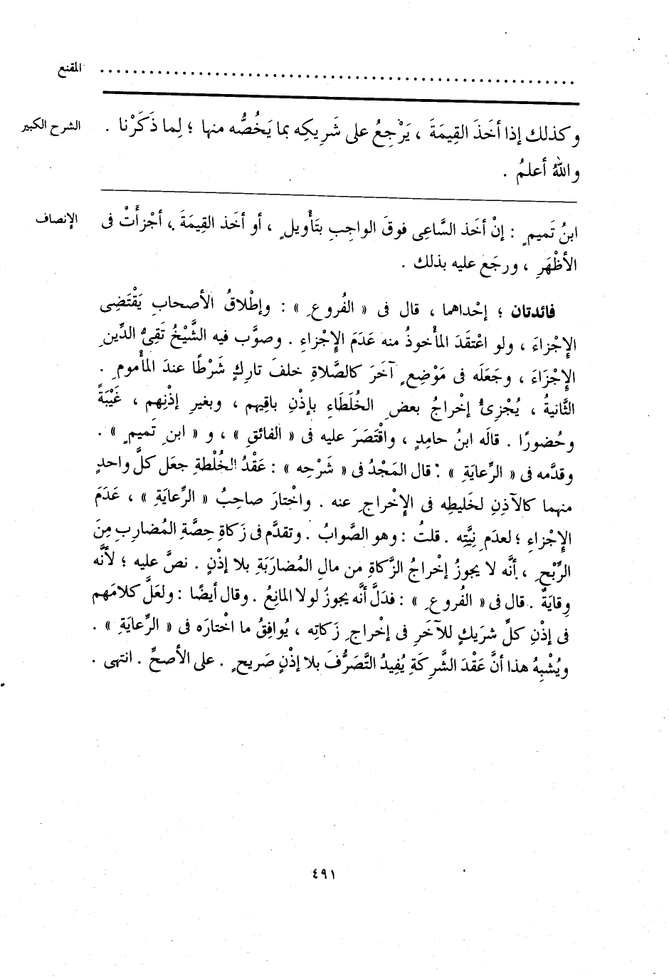 فائدتان؛ إحْداهما، قال فى «الفُروعِ»: وإطْلاقُ الأصحابِ يَقْتَضِى الإِجْزاءَ، ولو اعْتقَدَ المأْخوذُ منه عَدَمَ الإِجْزاءِ. وصوَّب فيه الشَّيْخُ تَقِىُّ الدِّين الإِجْزَاءَ، وجَعَلَه فى مَوْضِعٍ آخَرَ كالصَّلاةِ خلفَ تارِكٍ شَرْطًا عندَ المأْمومِ. الثَّانيةُ، يُجْزِئُ إخْراجُ بعضِ الخُلَطَاءِ بإذْنِ باقِيهم، وبغيرِ إذْنِهم، غَيْبَةً وحُضورًا. قالَه ابنُ حامِدٍ، واقْتَصَرَ عليه فى «الفائقِ»، و «ابنِ تَميمٍ». وقدَّمه فى «الرِّعايَةِ»: قال المَجْدُ فى «شَرْحِه»: عَقْدُ الخُلْطةِ جعَل كلَّ واحدٍ منهما كالآذِنِ لخَليطِه فى الإِخْراجِ عنه. واخْتارَ صاحِبُ «الرِّعايَةِ»، عَدَمَ الإِجْزاءِ؛ لعدَمِ نِيَّتِه. قلتُ: وهو الصَّوابُ. وتقدَّم فى زَكاةِ حِصَّةِ المُضارِبِ مِنَ الرِّبْحِ، أنَّه لا يجوزُ إخْراجُ الزَّكاةِ من مالِ المُضارَبَةِ بلا إذْنٍ. نصَّ عليه؛ لأنَّه وِقايَةٌ. قال فى «الفُروعٍ»: فدَلَّ أنَّه يجوز لولا المانِعُ. وقال أيضًا: ولعَلَّ كلامَهم فى إذْنِ كلِّ شَريكٍ للآخرِ فى إخْراجِ زَكاتِه، يُوافِقُ ما اخْتارَه فى «الرِّعايَةِ». ويُشْبِهُ هذا أنَّ عَقْدَ الشَّرِكَةِ يُفِيدُ التَّصَرُّفَ بلا إذْنٍ صَريحٍ. على الأصحِّ. انتهى.