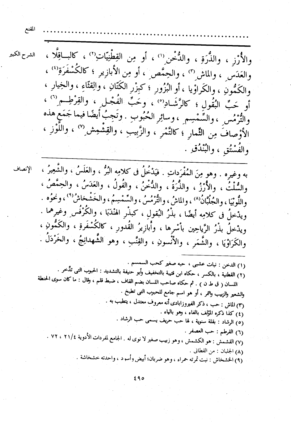 به وغيرِه. وهو مِنَ المُفْرَداتِ. فيَدْخُلُ فى كلامِه البُرُّ، والعَلَسُ، والشَّعِيرُ، والسُّلْتُ، والأُرْزُ، والذُّرَةُ، والدُّخْنُ، والفُولُ، والعَدَسُ، والحِمَّصُ، واللُّوبْيَا، والجُلُبَّانُ (¬1)، والماشُ، والتُّرْمُسُ، والسِّمْسِمُ، والخَشْخاشُ (¬2)، ونحوُه. ويدْخلُ فى كلامِه أيضًا، بذْرُ البُقولِ، كبذْرِ الهنْدَبَا، والكُرْفُسِ وغيرِهما. ويدْخلُ بذْرُ الرَّياحِين بأسْرِها، وأَبازِيرُ القُدورِ، كالكُسْفَرةِ، والكَمُّونِ، والكَرَاوْيَا، والشَّمَرِ، والأنْسونِ، والقِنَّبِ، وهو الشَّهدانِجُ، والخَرْدَلُ.