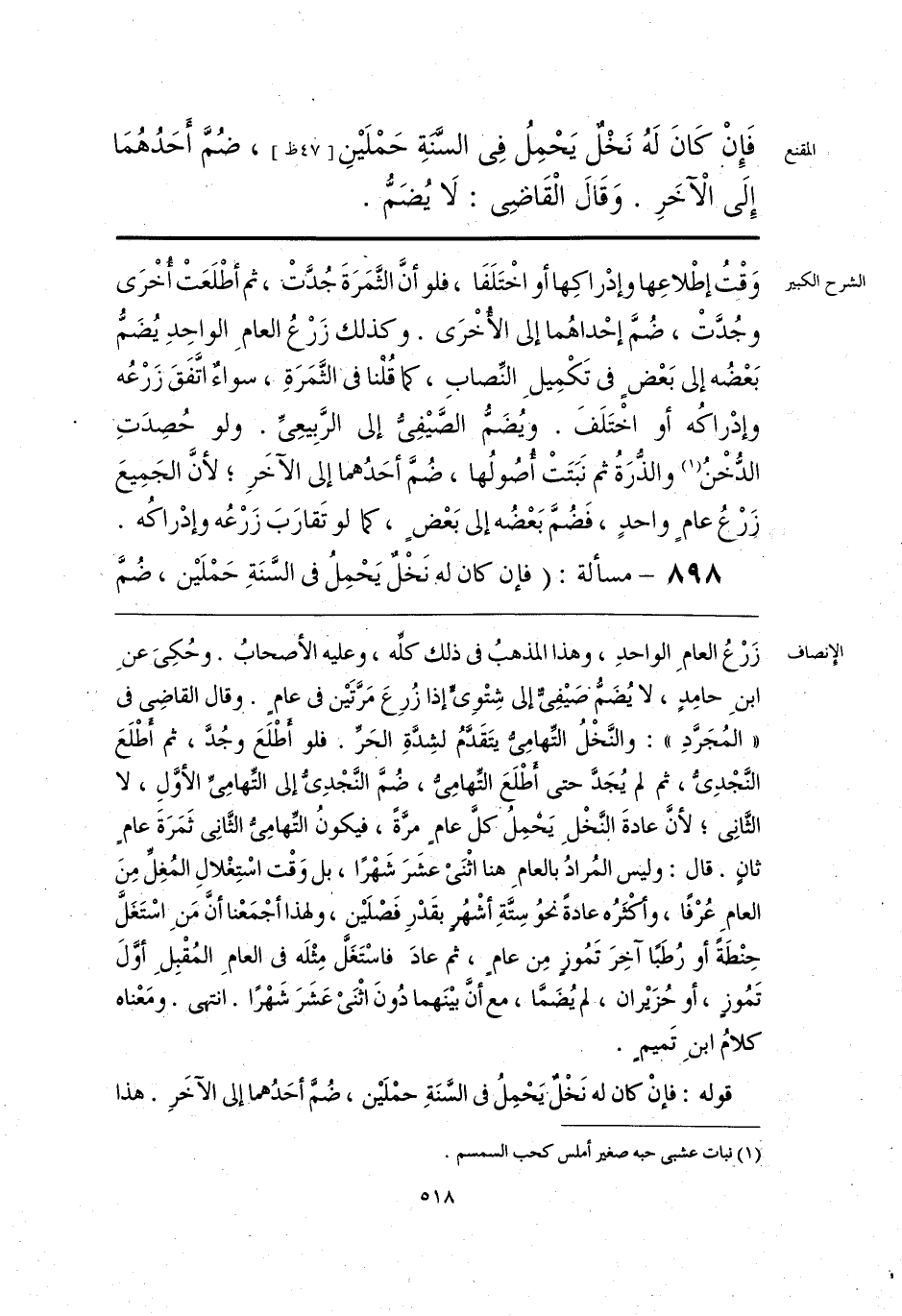 زَرْعُ العامِ الواحدِ، وهذا المذهبُ فى ذلك كلِّه، وعليه الأصحابُ. وحُكِىَ عنِ ابنِ حامِدٍ، لا يُضَمُّ صَيْفِىٌّ إلى شِتْوِىٍّ إذا زُرِعَ مَرَّتَيْن فى عامٍ. وقال القاضِى فى «المُجَرَّدِ»: والنَّخْلُ التِّهامِىُّ يتَقَدَّمُ لشِدَّةِ الحَرِّ. فلو أطْلَعَ وجُدَّ، ثم أطْلَعَ النَّجْدِىُّ، ثم لم يُجَدَّ حتى أطْلَع التِّهامِىُّ، ضُمَّ النَّجْدِىُّ إلى التِّهامِىِّ الأوَّلِ، لا الثَّانِى؛ لأنَّ عادةَ النَّخْلِ يَحْمِلُ كلَّ عامٍ مرَّةً، فيكونُ التِّهامِىُّ الثَّانِى ثَمَرَةَ عامٍ ثانٍ. قال: وليس المُرادُ بالعامِ هنا اثْنَىْ عشَرَ شَهْرًا، بل وَقْت اسْتِغْلالِ المُغِلِّ مِنَ العامِ عُرْفًا، وأكْثَرُه عادةً نحوُ سِتَّةِ أشْهُرٍ بقَدْرِ فَصْلَيْن، ولهذا أجْمَعْنا أنَّ مَنِ اسْتَغَلَّ حِنْطَةً أو رُطَبًا آخِرَ تَمُوزٍ مِن عامٍ، ثم عادَ فاسْتَغَلَّ مِثْلَه فى العامِ المُقْبِلِ أوَّلَ لمُوزٍ، أو حُزَيْران، لم يُضَمَّا، مع أنَّ بيْنَهما دُونَ اثْنَىْ عَشَرَ شَهْرًا. انتهى. ومَعْناه كلامُ ابنَ تَميمٍ.