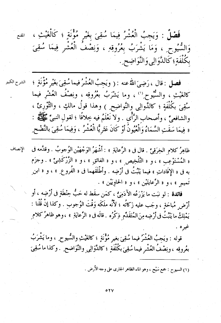 قوله: ويَجِبُ العُشْرُ فيما سُقِىَ بغيرِ مُؤْنَةٍ، كالغَيْثِ والسُّيوحِ، وما يَشْرَبُ بعُروقِه، ونِصْفُ العُشْرِ فيما سُقِىَ بكُلْفَةٍ؛ كالدَّوَالِىِ والنَّوَاضحِ. وكذا ما سُقِىَ
