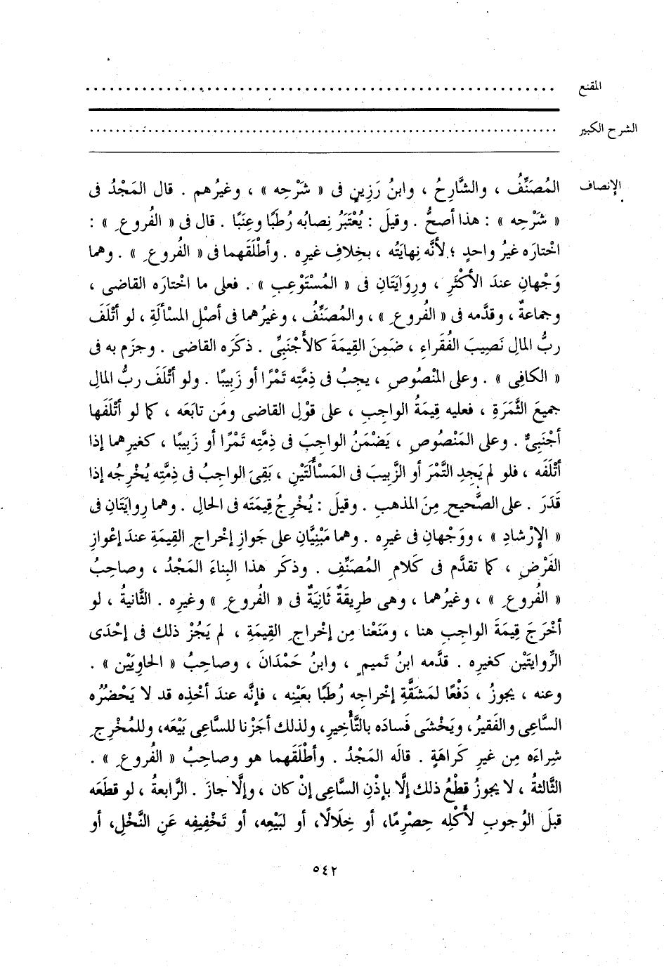 المُصَنِّفُ، والشَّارِحُ، وابنُ رَزِين فى «شَرْحِه»، وغيرُهم. قال المَجْدُ فى «شَرْحِه»: هذا أصحُّ. وقيلَ: يُعْتَبَرُ نِصابُه رُطبا وعِنَبًا. قال فى «الفُروعِ»: اخْتارَه غيرُ واحدٍ؛ لأنَّه نِهايَتُه، بخِلافِ غيرِه. وأطْلَقَهما فى «الفُروعِ». وهما وَجْهانِ عندَ الأكْثَرِ، ورِوَايَتَانِ فى «المُسْتَوْعِبِ». فعلى ما اخْتارَه القاضى، وجماعةٌ، وقدَّمه فى «الفُروعِ»، والمُصَنِّفُ، وغيرُهما فى أصْلِ المسْألَةِ، لو أتْلَفَ ربُّ المالِ نَصِيبَ الفُقَراءِ، ضَمِنَ القِيمَةَ كالأجْنَبِىِّ. ذكَرَه القاضى. وجزَم به فى «الكافِى». وعلى المنْصُوصِ، يجِبُ فى ذِمَّتِه تَمْرًا أو زَبِيبًا. ولو أتْلَفَ ربُّ المالِ جميعَ الثَّمَرَةِ، فعليه قِيمَةُ الواجِبِ، على قوْلِ القاضى ومَن تابَعَه، كما لو أتْلَفَها أجْنَبِىٌّ. وعلى المَنْصُوصِ، يَضْمَنُ الواجِبَ فى ذِمَّتِه تَمْرًا أو زَبِيبًا، كغيرِهما إذا أتْلَفَه، فلو لم يجدِ التَّمْرَ أو الزَّبِيبَ فى المَسْأَلتَيْنِ، بَقِىَ الواجِبُ فى ذِمَّتِه يُخْرِجُه إذا قَدَرَ. على الصَّحيحِ مِنَ المذهبِ. وقيلَ: يُخْرِجُ قِيمَتَه فى الحالِ. وهما رِوايَتَانِ فى «الإِرْشادِ»، ووَجْهانِ فى غيرِه. وهما مَبْنِيَّانِ على جَوازِ إخْراجِ القِيمَةِ عندَ إعْوازِ الفَرْضِ، كما تقدَّم فى كَلامِ المُصَنِّفِ. وذكَر هذا البِناءَ المَجْدُ، وصاحِبُ «الفُروعِ»، وغيرُهما، وهى طرِيقَة ثَانِيَةٌ فى «الفُروعِ» وغيرِه. الثَّانيةُ، لو أخْرَجَ قِيمَةَ الواجِبِ هنا، ومَنَعْنا مِن إخْراجِ القِيمَةِ، لم يَجُزْ ذلك فى إحْدَى الرِّوايتَيْن كغيرِه. قدَّمه ابنُ تَميمٍ، وابنُ حَمْدَانَ، وصاحِبُ «الحاوِيَيْن». وعنه، يجوزُ، دَفْعًا لمَشَقَّةِ إخْراجِه رُطَبًا بعَيْنِه، فإنَّه عندَ أخْذِه قد لا يَحْضُرُه السَّاعِى والفَقيرُ، ويَخْشَى فَسادَه بالتَّأْخِيرِ، ولذلك أجَزْنا للسَّاعِى بَيْعَه، وللمُخْرِجِ شِراءَه مِن غيرِ كَراهَةٍ. قالَه المَجْدُ. وأطْلَقَهما هو وصاحِبُ «الفُروعِ». الثَّالثةُ، لا يجوزُ قطْعُ ذلك إلَّا بإذْنِ السَّاعِى إنْ كان، وإلَّا جازَ. الرَّابعةُ، لو قطَعَه قبلَ الوُجوبِ لأَكْلِه حِصْرِمًا، أو خِلَالًا، أو لبَيْعِه، أو تَخْفِيفِه عَنِ النَّخْلِ، أو