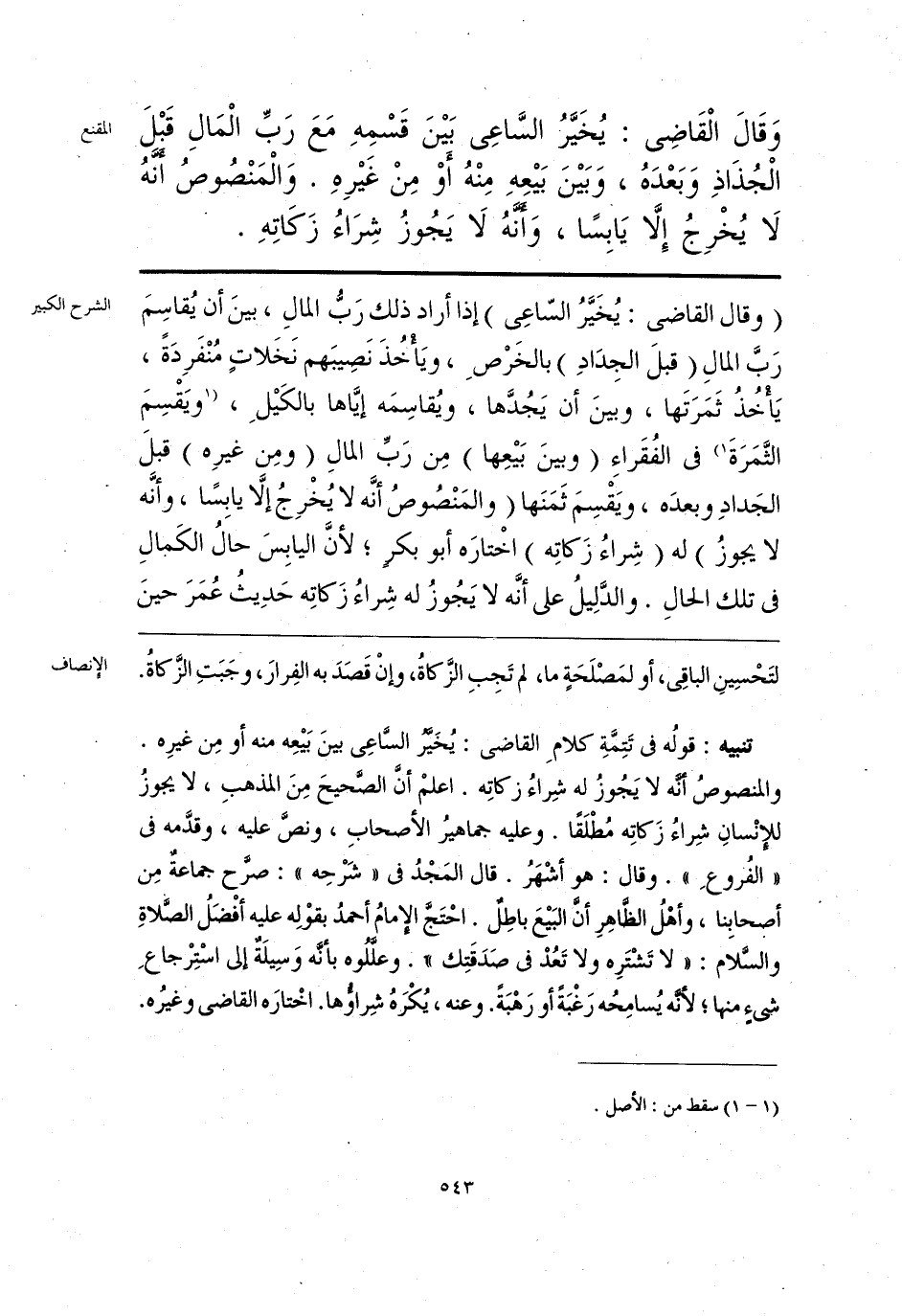 تنبيه: قولُه فى تَتِمَّةِ كلامِ القاضى: يُخَيَّرُ السَّاعِى بينَ بَيْعِه منه أو مِن غيرِه. والمنصوصُ أنَّه لا يَجُوزُ له شِراءُ زكاتِه. اعلمْ أنَّ الصَّحيحَ مِنَ المذهبِ، لا يجوزُ للإِنْسانِ شِراءُ زَكاتِه مُطْلَقًا. وعليه جماهيرُ الأصحابِ، ونصَّ عليه، وقدَّمه فى «الفُروعِ». وقال: هو أشْهَرُ. قال المَجْدُ فى «شَرْحِه»: صرَّح جماعةٌ مِن أصحابِنا، وأهْلُ الظاهِرِ أنَّ البَيْعَ باطِلٌ. احْتَجَّ الإِمامُ أحمدُ بقوْلِه عليه أفْضَلُ الصَّلاةِ والسَّلام: «لا تَشْتَرِه ولا تَعُدْ فى صَدَقَتِك». وعلَّلُوه بأنَّه وَسِيلَةٌ إلى اسْتِرْجاعِ شئٍ منها؛ لأنَّه يُسامِحُه رَغْبَةً أو رَهْبَةً. وعنه، يُكْرَهُ شِراؤُها. اخْتارَه القاضى وغيرُه.