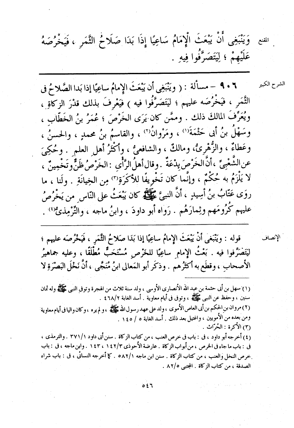 قوله: ويَنْبَغى أنْ يَبْعَثَ الإِمامُ ساعِيًا إذا بَدَا صَلاحُ الثمَرِ، فَيَخْرُصَه عليهم؛ ليَتَصَرَّفوا فيه. بَعْثُ الإِمامِ ساعِيًا للخَرْصِ مُسْتَحَبٌّ مُطْلَقًا، وعليه جماهيرُ الأصحابِ، وقطع به أكثَرُهم. وذكَر أبو المَعالى ابنُ مُنَجَّى، أنَّ نَخْلَ البَصْرَةِ لا