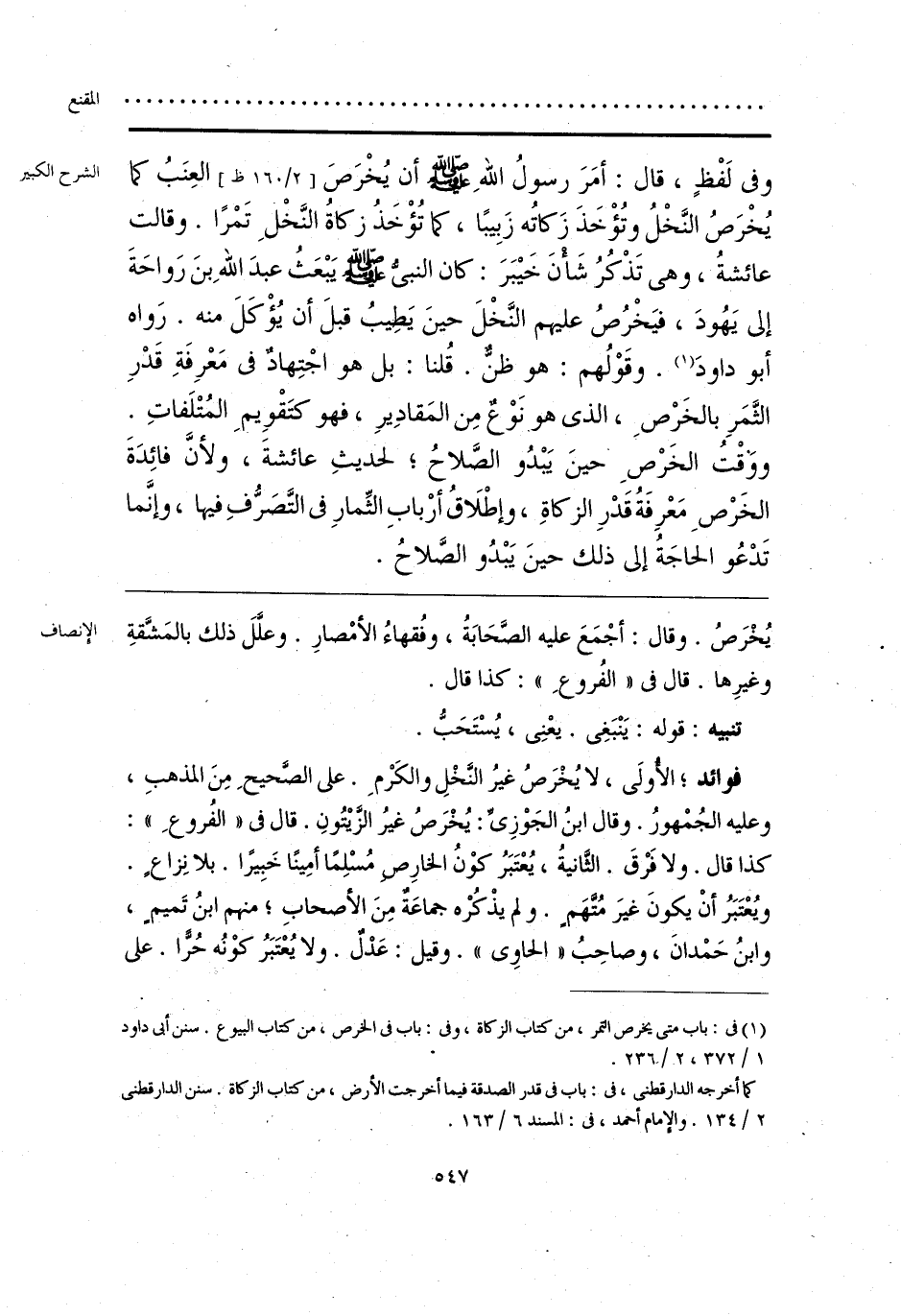 فوائد؛ الأُولَى، لا يُخْرَصُ غيرُ النَّخْلِ والكَرْمِ. على الصَّحيحِ مِنَ المذهبِ، وعليه الجُمْهورُ. وقال ابنُ الجَوْزِىِّ: يُخْرَصُ غيرُ الزَّيْتُونِ. قال فى «الفُروعِ»: كذا قال. ولا فَرْقَ. الثَّانيةُ، يُعْتَبَرُ كوْنُ الخارِصِ مُسْلِمًا أمِينًا خَبِيرًا. بلا نِزاعٍ. ويُعْتَبَرُ أنْ يكونَ غيرَ مُتَّهَم. ولم يذْكُرْه جماعَةٌ مِنَ الأصحابِ؛ منهم ابنُ تَميمٍ، وابنُ حَمْدانَ، وصاحِبُ «الحاوِى». وقيل: عَدْلٌ. ولا يُعْتَبَرُ كوْنُه حُرًّا. على