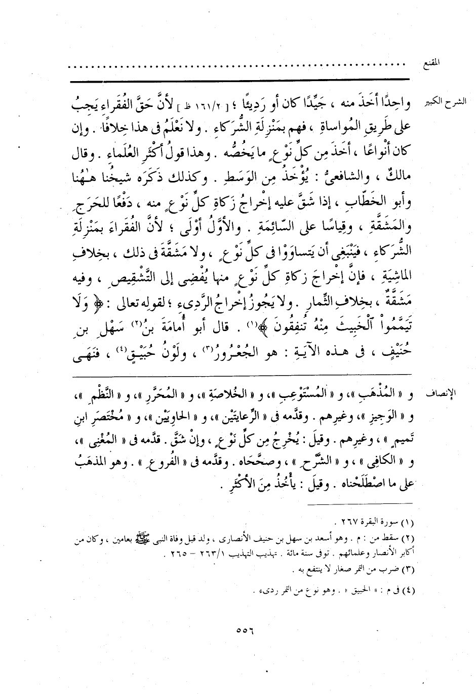 و «المُذْهَبِ»، و «المُسْتَوْعِبِ»، و «الخُلاصَةِ»، و «المُحَرَّرِ»، و «النَّظْمِ»، و «الوَجِيزِ»، وغيرِهم. وقدَّمه فى «الرِّعايَتَيْن»، و «الحاوِيَيْن»، و «مُخْتَصَرِ ابنِ تَميمٍ»، وغيرِهم. وقيلَ: يُخْرِجُ مِن كلِّ نَوْعٍ، وإنْ شَقَّ. قدَّمه فى «المُغْنِى»، و «الكافِى»، و «الشَّرْحِ»، وصحَّحَاه. وقدَّمه فى «الفُروعِ». وهو المذهَبُ على ما اصْطَلَحْناه. وقيلَ: يأْخُذُ مِنَ الأكْثَرَ.