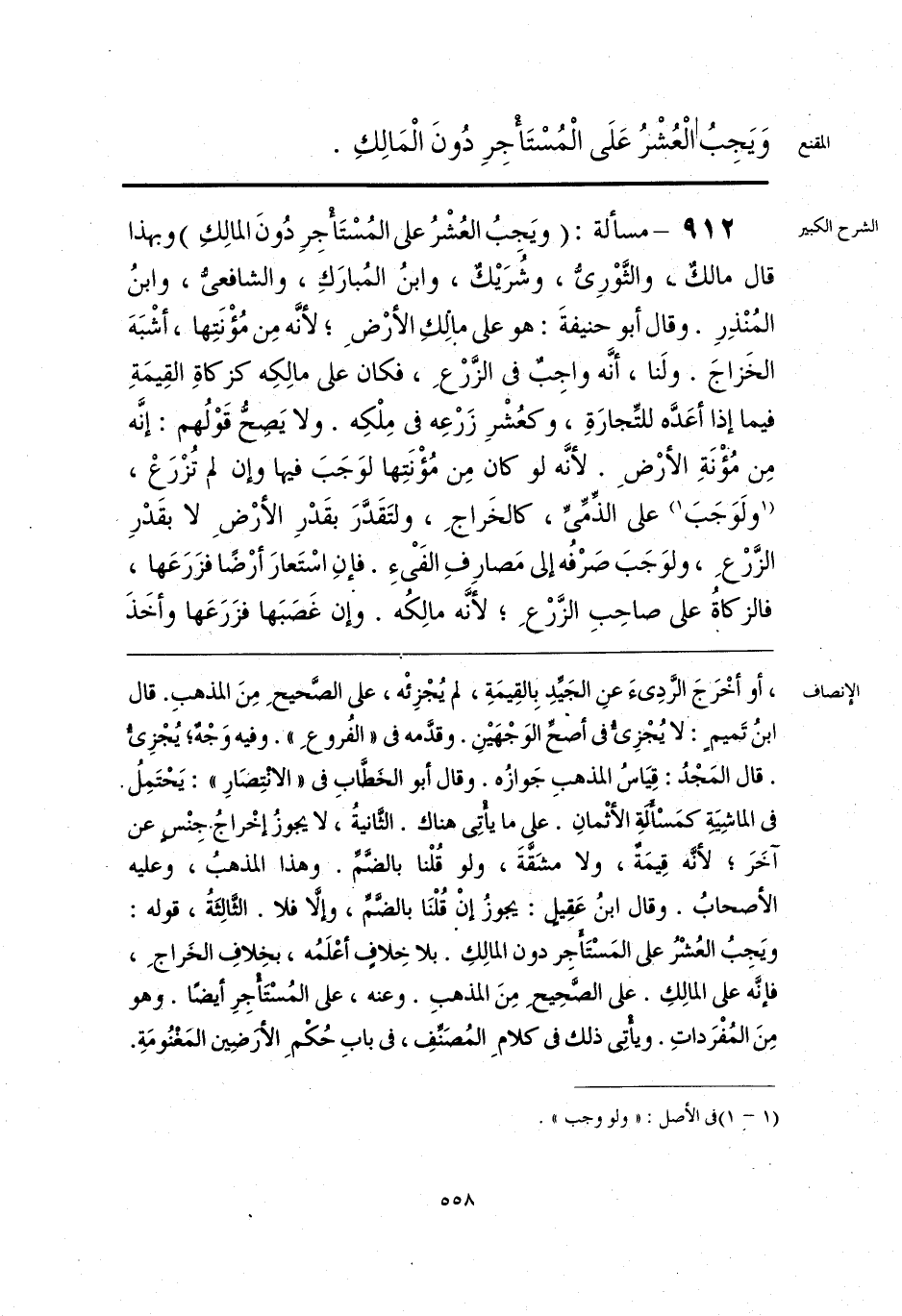 وَيَجِبُ الْعُشرُ عَلَى الْمُسْتَأْجِرِ دُونَ الْمَالِكِ.