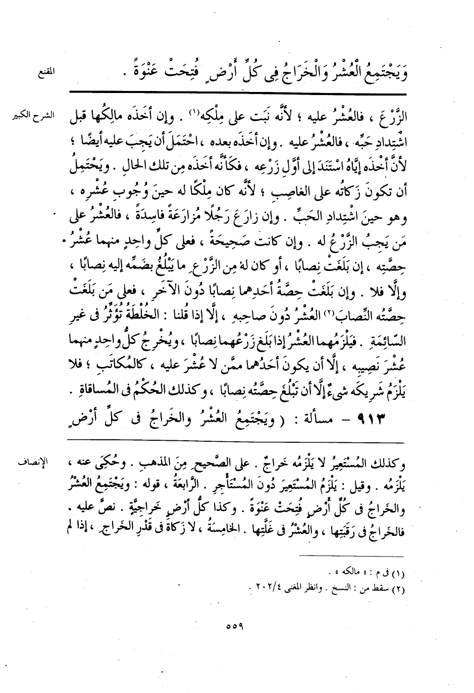 وكذلك المُسْتَعِيرُ لا يَلْزَمُه خَراجٌ. على الصَّحيحِ مِنَ المذهبِ. وحُكِىَ عنه، يَلْزَمُه. وقيل: يَلْزَمُ المُسْتَعِيرَ دُونَ المُسْتَأْجِرِ. الرَّابعَةُ، قوله: ويَجْتَمِعُ العُشْرُ والخَراجُ فى كُلِّ أرْضٍ فُتِحَتْ عَنْوَةً. وكذا كلُّ أرْضٍ خَراجيَّةٍ. نصَّ عليه. فالخَراجُ فى رَقَبَتِها، والعُشْرُ فى غَلَّتِها. الخامِسَةُ، لا زَكاةَ فى قَدْرِ الخَراجِ، إذا لم