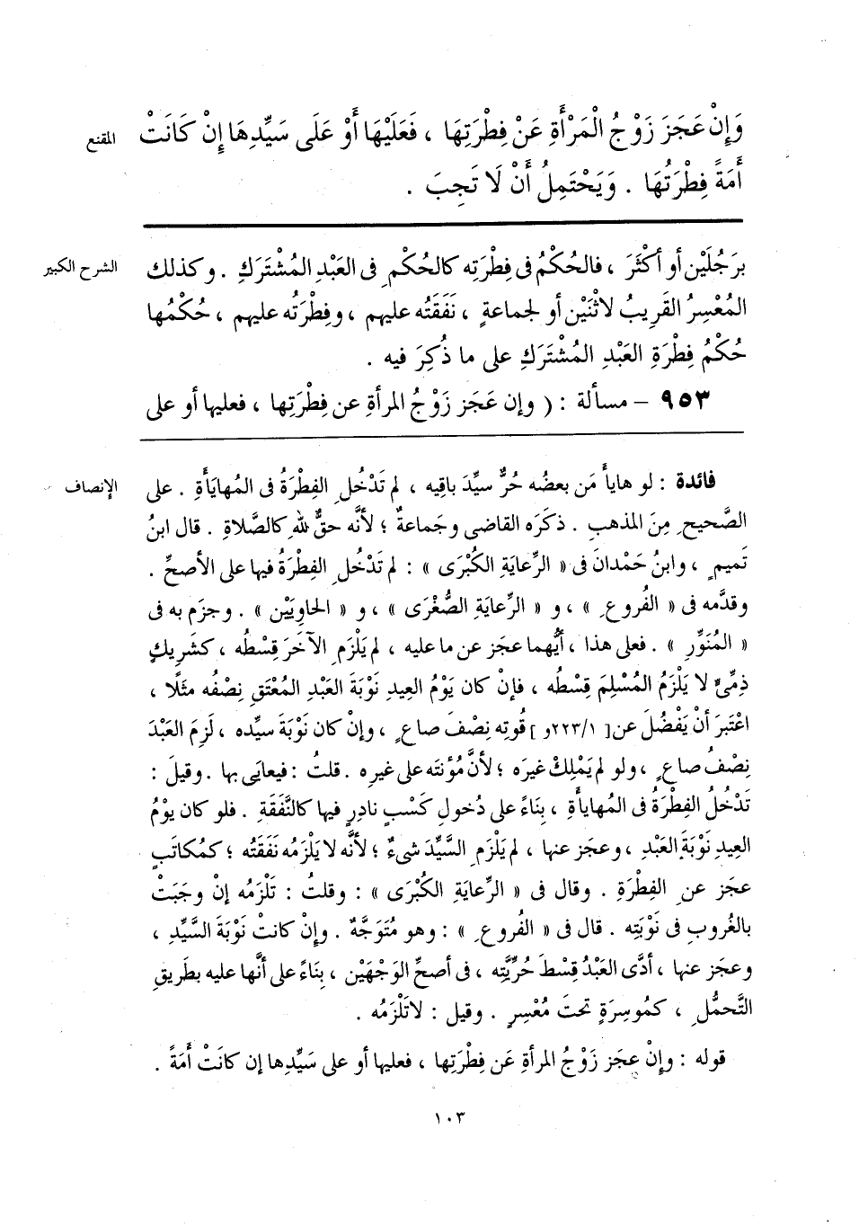 فائدة: لو هايأَ مَن بعضُه حُرٌّ سيِّدَ باقِيه، لم تَدْخُلِ الفِطْرَةُ فى المُهايَأَةِ. على الصَّحيحِ مِنَ المذهبِ. ذكَرَه القاضى وجَماعةٌ؛ لأنَّه حقٌّ للَّهِ كالصَّلاةِ. قال ابنُ تَميمٍ، وابنُ حَمْدانَ فى «الرِّعايَةِ الكُبْرَى»: لم تَدْخُلِ الفِطْرَةُ فيها على الأصحِّ. وقدَّمه فى «الفُروعِ»، و «الرِّعايَةِ الصُّغْرَى»، و «الحاوِيَيْن». وجزَم به فى «المُنَوِّرِ». فعلى هذا، أيُّهما عجَز عن ما عليه، لِم يَلْزَمِ الآخرَ قِسْطُه، كشَرِيكٍ ذِمِّىٍّ لا يَلْزَمُ المُسْلِمَ قِسْطُه، فإنْ كان يَوْمُ العِيدِ نوْبَةَ العَبْدِ المُعْتَقِ نِصْفُه مثَلًا، اعْتَبرَ أنْ يَفْضُلَ عن قُوتِه نِصْفَ صاعٍ، وإنْ كان نوْبَةَ سيِّده، لَزِمَ العَبْدَ نِصْفُ صاعٍ، ولو لم يَمْلِكْ غيرَه؛ لأنَّ مُؤنتَه على غيرِه. قلتُ: فيعايَى بها. وقيلَ: تَدْخُلُ الفِطْرَةُ فى المُهايأَةِ، بِنَاءً على دُخولِ كَسْبٍ نادِرٍ فيها كالنَّفَقَةِ. فلو كان يوْمُ العِيدِ نوْبَة العَبْدِ، وعجَز عنها, لم يَلْزَمِ السَّيِّدَ شئٌ؛ لأنَّه لا يَلْزَمُه نَفَقَتُه، كمُكاتَبٍ عجَز عنِ الفِطْرَةِ. وقال فى «الرِّعايَةِ الكُبْرَى»: وقلتُ: تَلْزَمُه إنْ وجَبَتْ بالغُروبِ فى نَوْبَتِه. قال فى «الفُروعِ»: وهو مُتَوَجَّهٌ. وِإنْ كانتْ نَوْبَةَ السَّيِّدِ، وعجَز عنها، أدَّى العَبْدُ قِسْطَ حُرِّيَّتِه، فى أصحِّ الوَجْهَيْن، بِنَاءً على أنَّها عليه بطرَيقِ التَّحمُّلِ، كمُوسِرَةٍ تحتَ مُعْسِر. وقيل: لا تَلْزَمُه.