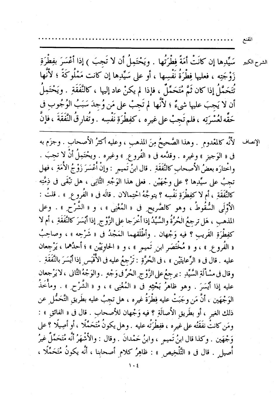 لأنَّه كالمعْدومِ. وهذا الصَّحيحُ مِنَ المذهبِ، وعليه أكثرُ الأصحابِ. وجزَم به فى «الوَجيزِ» وغيرِه. وقدَّمه فى «الفُروعِ» وغيرِه. ويحْتَمِلُ أنْ لا تجِبَ. واخْتارَه بعضُ الأصحابِ كالنَّفَقَةِ. قال ابنُ تَميمٍ: وإنْ أعْسَرَ زَوْجُ الأمَةِ، فهل تجِبُ على سيِّدِها؟ على وجْهَيْن. فعلى هذا الوَجْهِ الثَّانِى، هل تبْقَى فى ذِمَّتِه كالنَّفَقَةِ، أم لا كفِطْرَةِ نَفْسِه؟ يتوجَّهُ احْتِمالان. قالَه فى «الفُروعِ». قلتُ: الأُوْلَى السُّقُوطُ، وهو كالصَّريحِ فى «المُغْنِى»، و «الشَّرْحِ». وعلى المذهبِ، هَل ترجِعُ الْحُرَّةُ والسَّيِّدُ إذا أخْرَجا على الزَّوْجِ إذا أَيْسَرَ كالنَّفَقَةِ، أم لا كفِطْرَةِ القَريبِ؟ فيه وَجْهان. وأطْلَقهما المَجْدُ فى «شَرْحِه»، وصاحِبُ «الفُروعِ»، و «مُخْتَصَرِ ابنِ تَميمٍ»، و «الحاوِيَيْن»؛ أحدُهما، يَرْجِعان عليه. قال فى «الرِّعايتَيْن»، فى الحُرَّةِ: تَرْجِعُ عليه فى الأَقْيَسِ إذا أيْسَرَ بالنَّفَقَةِ. وقال فى مسْألَةِ السَّيِّدِ: يرجِعُ على الزَّوْجِ الحُرِّ فى وَجْهٍ. والوَجْهُ الثَّانى، لا يَرْجعان عليه إذا أَيْسَرَ. وهو ظاهرُ بَحْثِهِ فى «المُغْنِى»، و «الشَّرْحِ». ومأْخَذُ الوَجْهَين، أنَّ مَن وجَبَتْ عليه فِطْرَةُ غيرِه، هل تجِبُ عليه بطَريقِ التَّحَمُّلِ عن ذلك الغيرِ، أو بطَريقِ الأصالَةِ؟ فيه وَجْهان للأصحابِ. قال فى «الفائقِ»: ومَن كانتْ نفَقَتُه على غيرِه، ففِطْرَتُه عليه. وهل يكونُ مُتَحَمِّلًا، أو أصِيلًا؟ على وَجْهَين. وكذا قال ابنُ تَميمٍ، وابنُ حَمْدانَ. وقال: والأشْهَرُ أنَّه مُتَحَمِّلٌ غيرُ أصيل. قال فى «التَّلْخِيصِ»: ظاهِرُ كلامِ أصحابِنا، أنَّه يكونُ مُتَحَمِّلًا،