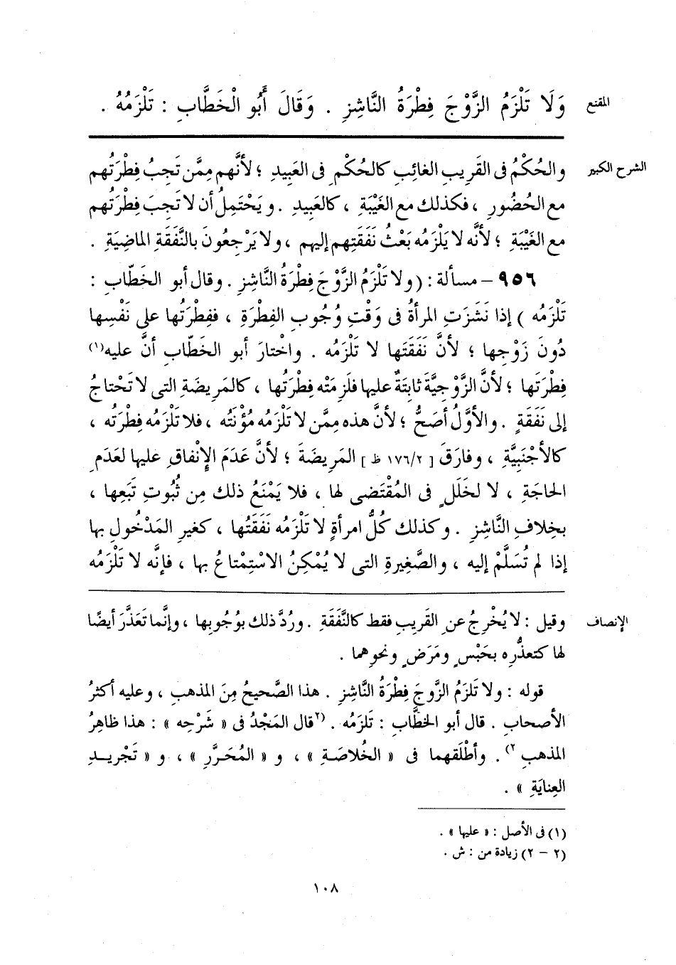 قوله: ولا تَلزَمُ الزَّوجَ فِطْرَةُ النَّاشِزِ. هذا الصَّحيحُ مِنَ المذهبِ، وعليه أكثرُ الأصحابِ. قال أبو الخطَّابِ: تَلزَمُه. [قال المَجْدُ فى «شَرْحِه»: هذا ظاهِرُ المذهبِ] (¬1). وأطْلَقهما فى «الخُلاصَةِ»، و «المُحَرَّرِ»، و «تَجْريدِ العِنايَةِ».