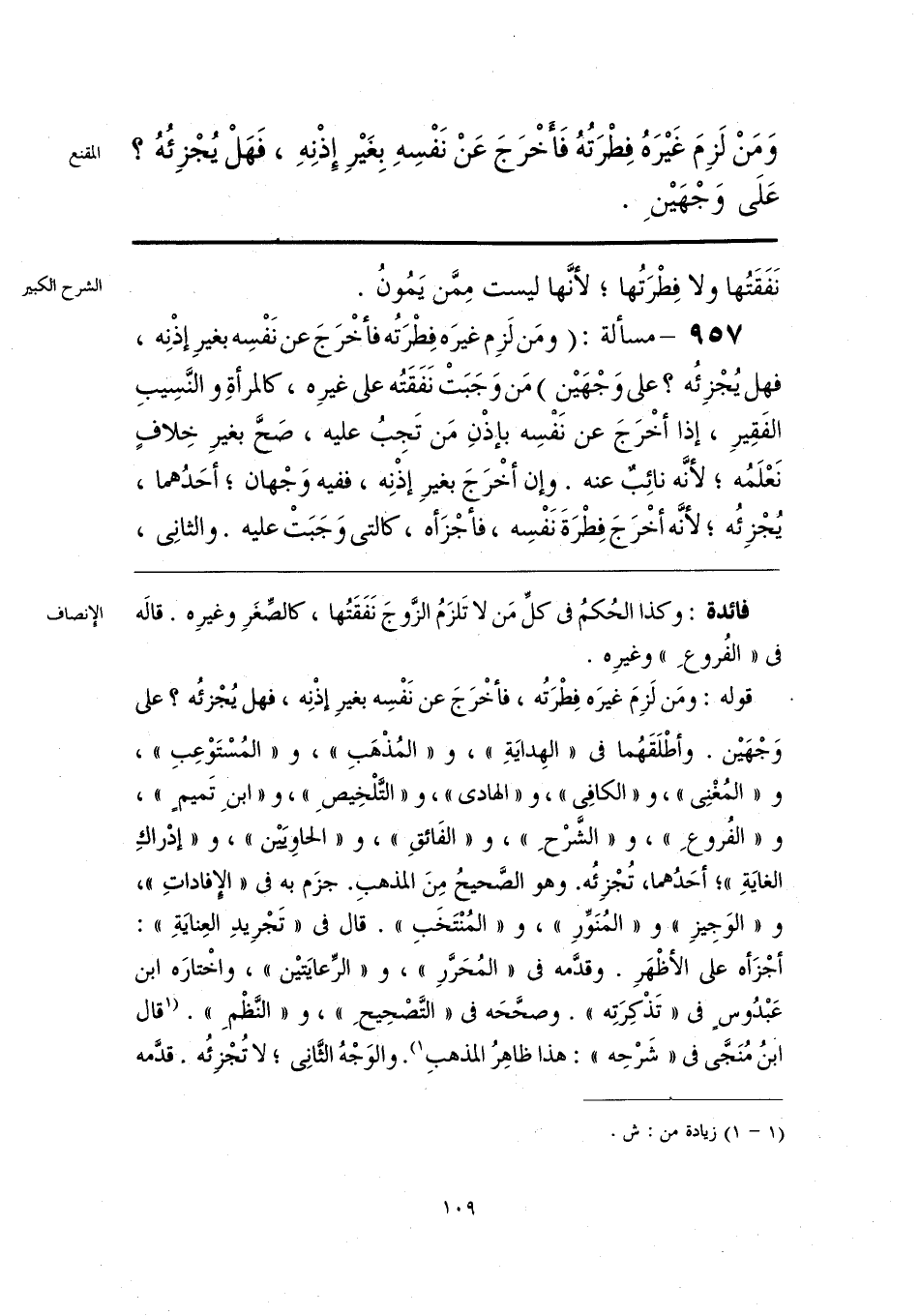 قوله: ومَن لَزِمَ غيرَه فِطْرَتُه، فأخْرَجَ عن نَفْسِه بغيرِ إذْنِه، فهل يُجْزئُه؟ على وَجْهَيْن. وأطْلَقَهُما فى «الهِدايَةِ»، و «المُذْهَبِ»، و «المُسْتَوْعِبِ»، و «المُغْنِى»، و «الكافِى»، و «الهادى»، و «التَّلْخِيصِ»، و «ابنِ تَميمٍ»، و «الفُروعِ»، و «الشَّرْحِ»، و «الفَائقِ»، و «الحاوِيَيْن»، و «إدْراكِ الغايَةِ»؛ أحَدُهما، تُجْزِئُه. وهو الصَّحيحُ مِنَ المذهبِ. جزَم به فى «الإِفاداتِ»، و «الوَجِيزِ» و «المُنَوِّرِ»، و «المُنْتَخَبِ». قال فى «تَجْرِيدِ العِنايَةِ»: أجْزَأه على الأظْهَرِ. وقدَّمه فى «المُحَرَّرِ»، و «الرِّعايَتيْن»، واخْتارَه ابن عَبْدُوسٍ فى «تَذْكِرَتِه». وصحَّحَه فى «التَّصْحِيحِ»، و «النَّظْمِ». [قال ابنُ مُنَجَّى فى «شَرْحِه»: هذا ظاهِرُ المذهبِ] (¬1). والوَجْهُ الثَّانِى؛ لا تُجْزِئُه. قدَّمه