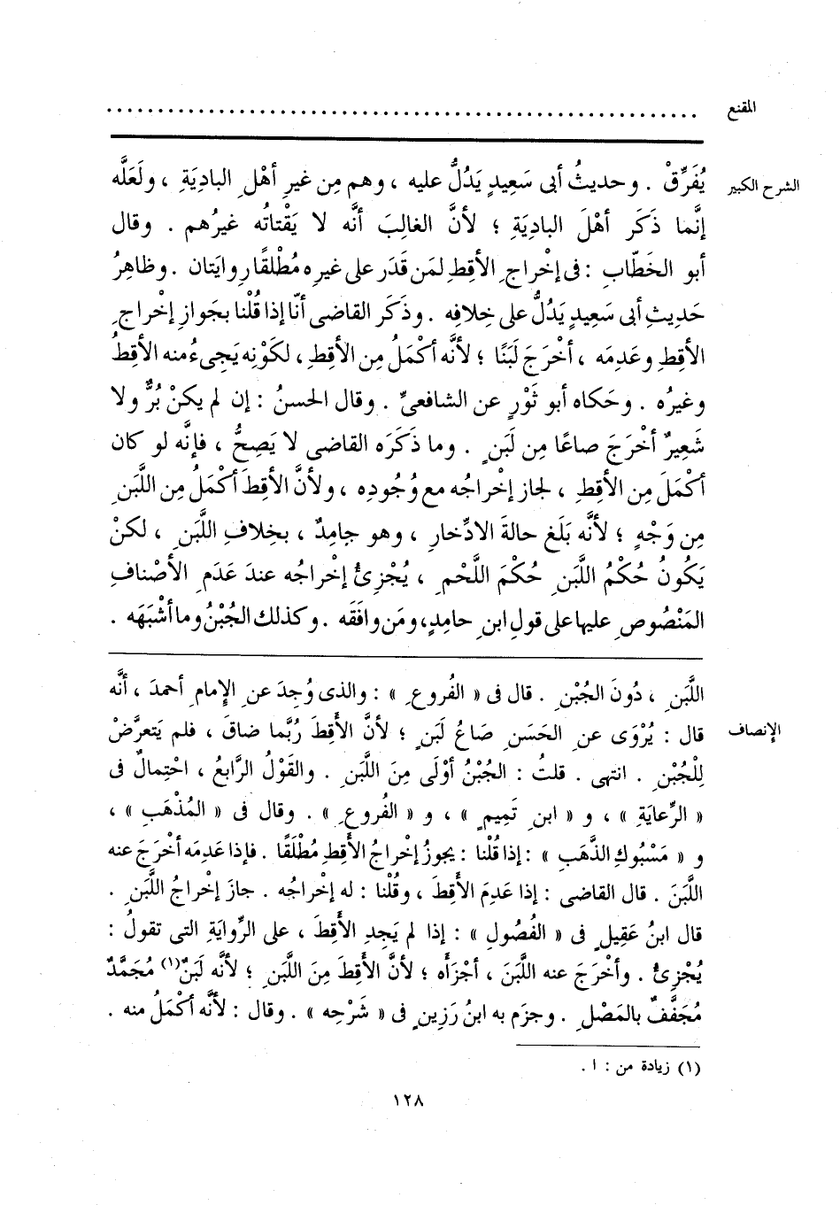 اللَّبَنِ، دُونَ الجُبْنِ. قال فى «الفُروعِ»: والذي وُجِدَ عنِ الإِمامِ أحمدَ، أنَّه قال: يُرْوَى عنِ الحَسَنِ صَاعُ لَبَنٍ؛ لأنَ الأقِطَ رُبَّما ضاقَ، فلم يَتعرَّضْ لِلْجُبْنِ. انتهى. قلتُ: الجُبْنُ أوْلَى مِنَ اللَّبَنِ. والقَوْلُ الرَّابعُ، احْتِمالٌ فى «الرِّعايَةِ»، و «ابنِ تَمِيمٍ»، و «الفُروعِ». وقال فى «المُذْهَبِ»، و «مَسْبُوكِ الذَّهَبِ»: إذا قُلْنا: يجوزُ إخْراجُ الأقِطِ مُطْلَقًا. فإذا عَدِمَه أخْرَجَ عنه اللَّبَنَ. قال القاضى: إذا عَدِمَ الأقِطَ، وقُلْنا: له إخْراجُه. جازَ إخْراجُ اللَّبَنِ. قال ابنُ عَقِيلٍ فى «الفُصُولِ»: إذا لم يَجِدِ الأقِطَ، على الرِّوايَةِ التى تقولُ: يُجْزِئُ. وأخْرَجَ عنه اللّبَنَ، أجْزَأَه؛ لأنَّ الأقِطَ مِنَ اللَّبَنِ؛ لأنَّه لَبَنٌ (¬1) مُجَمّدٌ مُجَفَّفٌ بالمَصْلِ. وجزَم به ابنُ رَزِين فى «شَرْحِه». وقال: لأنَّه أكمَلُ منه.