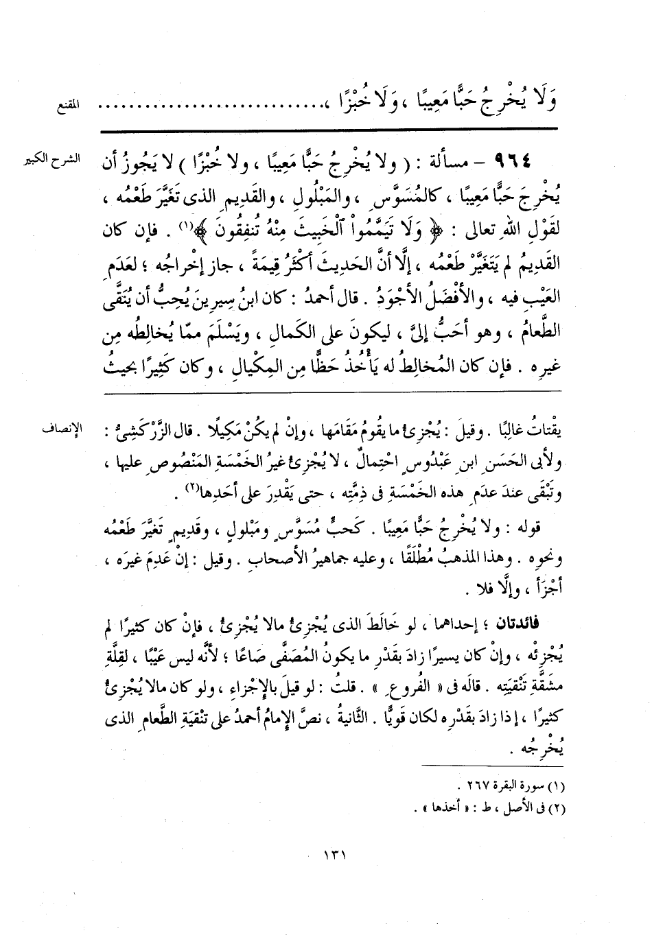 قوله: ولا يُخْرِجُ حَبًّا مَعِيبًا. كَحبٍّ مُسَوَّسٍ ومَبْلولٍ، وقَدِيمٍ تَغيَّرَ طَعْمُه ونحوِه. وهذا المذهبُ مُطْلَقًا، وعليه جماهيرُ الأصحابِ. وقيل: إن عَدِمَ غيرَه، أجْزَأ، وإلَّا فلا.