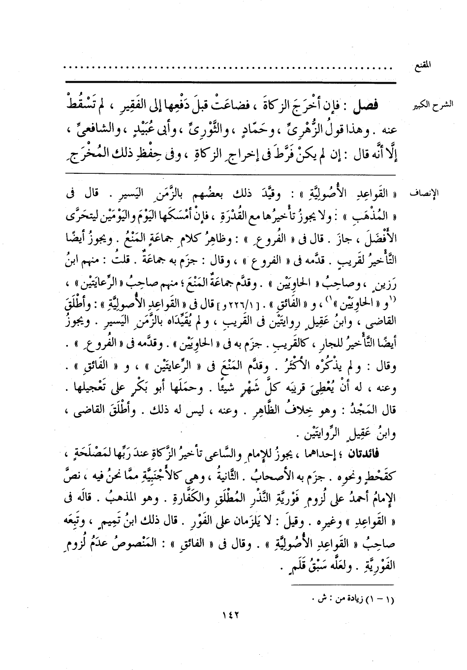 «القَواعِدِ الأُصُولِيَّةِ»: وقيَّدَ ذلك بعضُهم بالزَّمَنِ اليَسيرِ. قال فى «المُذْهَبِ»: ولا يجوزُ تأْخيرُها مع القُدْرَةِ، فإنْ أمْسَكَها اليَوْمَ واليَوْمَيْن ليتحَرَّى الأفْضَلَ، جازَ. قال فى «الفُروعِ»: وظاهِرُ كلامِ جماعَةٍ المَنْعُ. ويجوزُ أَيضًا التَّأْخيرُ لقَريبٍ. قدَّمه فى «الفروع»، وقال: جزَم به جماعَةٌ. قلتُ: منهم ابنُ رَزينٍ، وصاحِبُ «الحاوِيَيْن». وقدَّم جماعَةٌ المَنْعَ؛ منهم صاحِبُ «الرِّعايَتيْن»، [و «الحاوِيَيْن»] (¬1)، و «الفَائقِ». قال فى «القَواعِدِ الأُصولِيَّةِ»: وأطْلَقَ القاضى، وابنُ عَقِيلٍ رِوايتَيْن فى القَريبِ، ولم يُقَيِّدَاه بالزَّمَنِ اليَسيرِ. ويجوزُ أَيضًا التَّأخيرُ للجارِ، كالقَريبِ. جزَم به فى «الحاوِيَيْن». وقدَّمه فى «الفُروعِ». وقال: ولم يذْكُرْه الأكْثَرُ. وقدَّم المَنْع فى «الرِّعايتَيْن»، و «الفَائقِ». وعنه، له أنْ يُعْطِىَ قريبَه كلَّ شَهْرٍ شيئًا. وحمَلَها أبو بَكْرٍ على تَعْجيلها. قال المَجْدُ: وهو خِلافُ الظَّاهِرِ. وعنه، ليس له ذلك. وأطْلَقَ القاضى، وابنُ عَقِيل الرِّوايتَيْن.