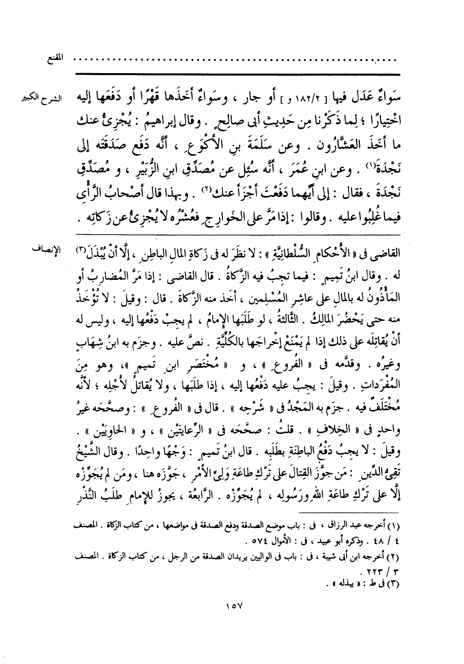 القاضى فى «الأَحْكامِ السُّلْطانِيَّةِ»: لا نظَرَ له فى زَكاةِ المالِ الباطِنِ، إلَّا أنْ يُبْذَلَ (¬1) له. وقال ابنُ تَمِيمٍ: فيما تجِبُ فيه الزَّكاةُ. قال القاضى: إذا مَرَّ المُضارِبُ أو المَأْذُونُ له بالمالِ على عاشِرِ المُسْلِمين، أخَذ منه الزَّكاةَ. قال: وقيلَ: لا تُؤْخَذ منه حتَّى يَحْضُرَ المالِكُ. الثَّالثةُ، لو طَلَبَها الإِمامُ، لم يجِبْ دَفْعُها إليه، وليس له أنْ يُقاتِلَه على ذلك إذا لم يَمْنَعْ إخْراجَها بالكُلِّيَّةِ. نصَّ عليه. وجزَم به ابنُ شِهَابٍ وغيرُه. وقدَّمه فى «الفُروعِ»، و «مُخْتَصَرِ ابنِ تَميمٍ»، وهو مِنَ المُفْرَداتِ. وقيلَ: يجِبُ عليه دَفْعُها إليه، إذا طلَبَها, ولا يُقاتلُ لأجْلِه؛ لأنَّه مُخْتَلَفٌ فيه. جزَم به المَجْدُ فى «شَرْحِه». قال فى «الفُروعِ»: وصحَّحَه غيرُ واحدٍ فى «الخِلافِ». قلتُ: صحَّحَه فى «الرِّعايتَيْن»، و «الحاوِيَيْن». وقيلَ: لا يجِبُ دَفْع الباطِنَةِ بطَلَبِه. قال ابنُ تَميمٍ: وَجْهًا واحِدًا. وقال الشَّيْخُ تَقِىُّ الدِّينِ: مَن جوَّزَ القِتالَ على تَرْكِ طاعَةِ وَلِىِّ الأمْرِ، جَوَّزَه هنا، ومَن لم يُجَوِّزْه إلَّا على تَرْكِ طاعَةِ اللَّهِ ورَسُولِه، لم يُجَوِّزْه. الرَّابعُة، يجوزُ للإمامِ طلَبُ النَّذْرِ
