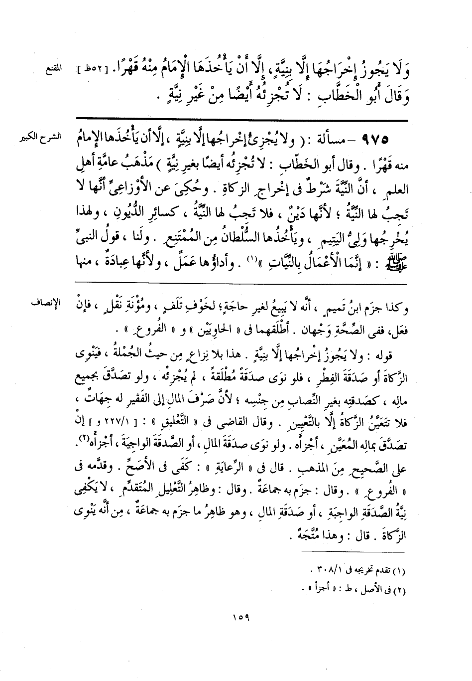 قوله: ولا يَجُوزُ إخْراجُها إلَّا بنِيَّةٍ. هذا بلا نِزاعٍ مِن حيثُ الجُمْلةُ، فيَنْوِى الزَّكاةَ أو صَدَقةَ الفِطْرِ، فلو نوَى صدَقةً مُطْلَقةً، لم يُجْزِئْه، ولو تصَدَّقَ بجميع مالِه، كصَدقتِه بغيرِ النِّصابِ مِن جِنْسِه؛ لأنَّ صَرْفَ المالِ إلى الفَقيرِ له جِهَاتٌ، فلا تتَعَيَّنُ الزَّكاةُ إلَّا بالتَّعْيينِ. وقال القاضى فى «التَّعْليقِ»: إنْ تصَدَّقَ بمالِه المُعَيَّنِ، أجْزَأَه. ولو نوَى صدَقةَ المالِ، أو الصَّدقةَ الواجِبَةَ، أجْزأَه (¬1). على الصَّحيِحِ مِنَ المذهبِ. قال فى «الرِّعايَةِ»: كَفَى فى الأصَحِّ. وقدَّمه فى «الفُروعِ». وقال: جزَم به جماعَةٌ. وقال: وظاهِرُ التَّعْلِيلِ المُتَقدِّمِ، لا يَكْفِى نِيَّةُ الصَّدَقَةِ الواجِبَةِ، أو صَدَقَةِ المالِ، وهو ظاهِرُ ما جزَم به جماعَة، مِن أنَّه يَنْوِى الزَّكاةَ. قال: وهذا مُتَّجَهٌ.