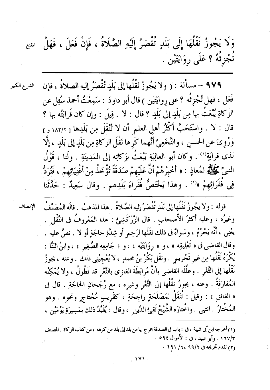 وَلَا يَجُوزُ نَقْلُهَا إِلَى بَلَدٍ تُقْصَرُ إِلَيْهِ الصَّلَاةُ، فَإِنْ فَعَلَ، فَهَلْ تُجْزِئُهُ؟ عَلَى رِوَايَتَيْن.