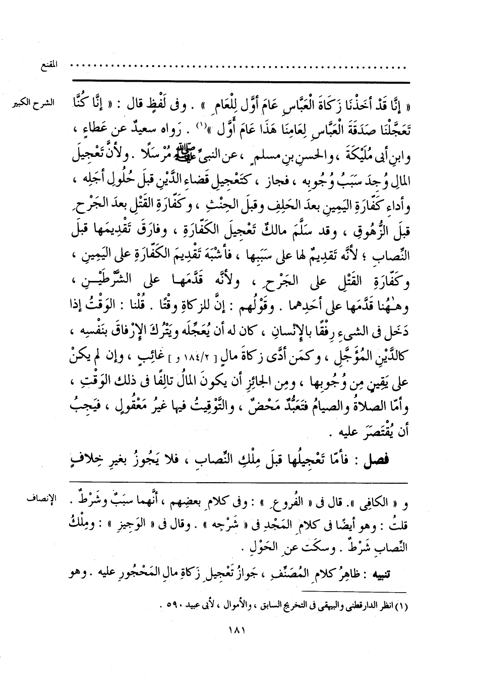 و «الكافِى». قال فى «الفُروعِ»: وفى كلامِ بعضِهم، أنَّهما سبَبٌ وشَرْطٌ. قلتُ: وهو أيضًا فى كلامِ المَجْدِ فى «شَرْحِه». وقال فى «الوَجِيزِ»: ومِلْكُ النِّصابِ شَرْطٌ. وسكَت عنِ الحَوْلِ. تنبيه: ظاهِرُ كلامِ المُصَنِّفِ، جَوازُ تَعْجِيلِ زَكاةِ مالِ المَحْجُورِ عليه. وهو