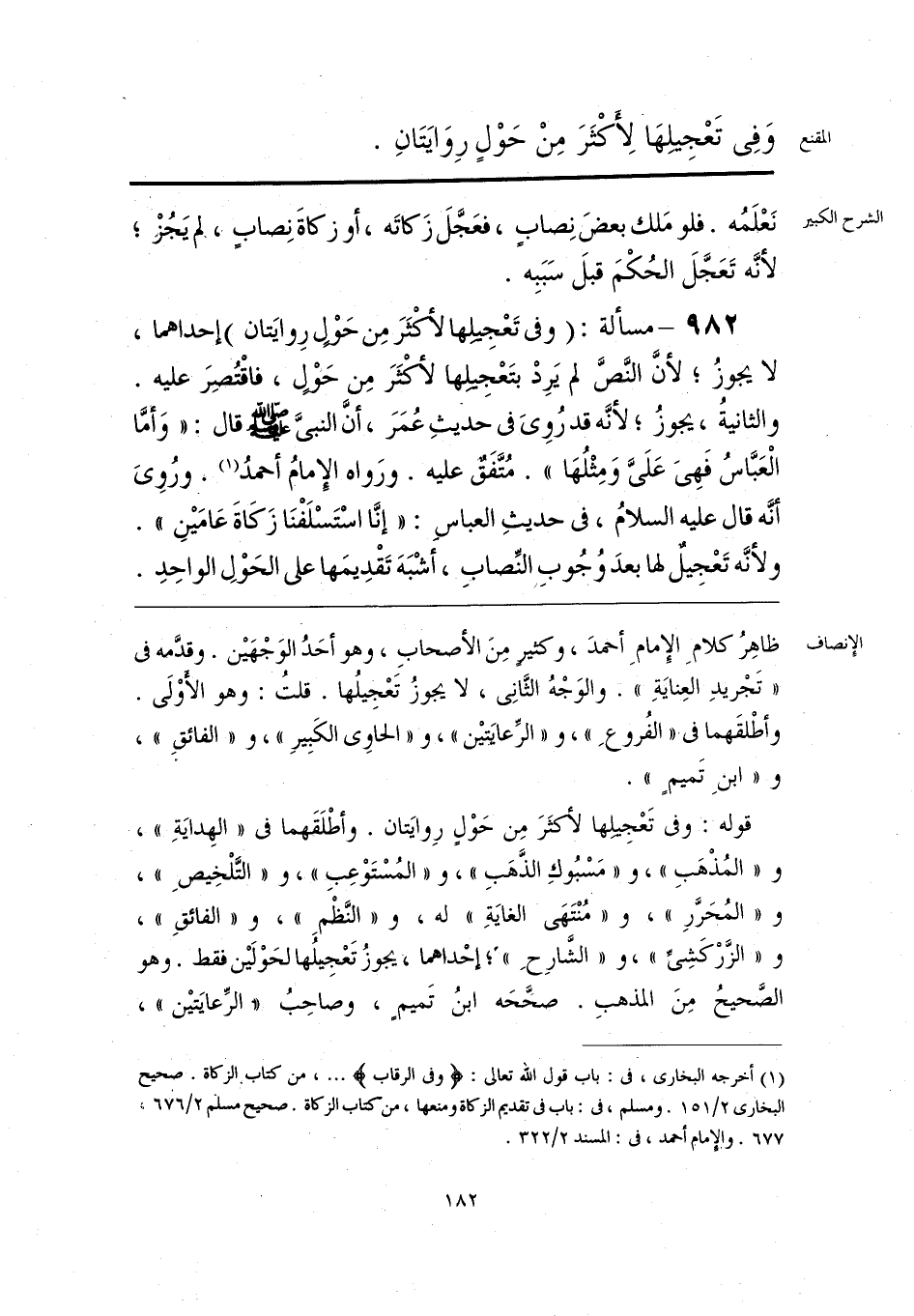 قوله: وفى تَعْجِيلها لأكثَرَ مِن حَوْلٍ رِوايَتان. وأطْلَقَهما فى «الهِدايَةِ»، و «المُذْهَبِ»، و «مَسْبُوكِ الذَّهَبِ»، و «المُسْتَوْعِبِ»، و «التَّلْخِيصِ»، و «المُحَرَّرِ»، و «مُنْتَهَى الغايَةِ» له، و «النَّظْمِ»، و «الفائقِ»، و «الزَّركَشِىِّ»، و «الشَّارِح»؛ إحْداهما، يجوزُ تَعْجِيلُها لحَوْلَيْن فقط. وهو الصَّحيحُ مِنَ المذهبِ. صحَّحَه ابنُ تَميمٍ، وصاحِبُ «الرِّعايَتيْن»،
