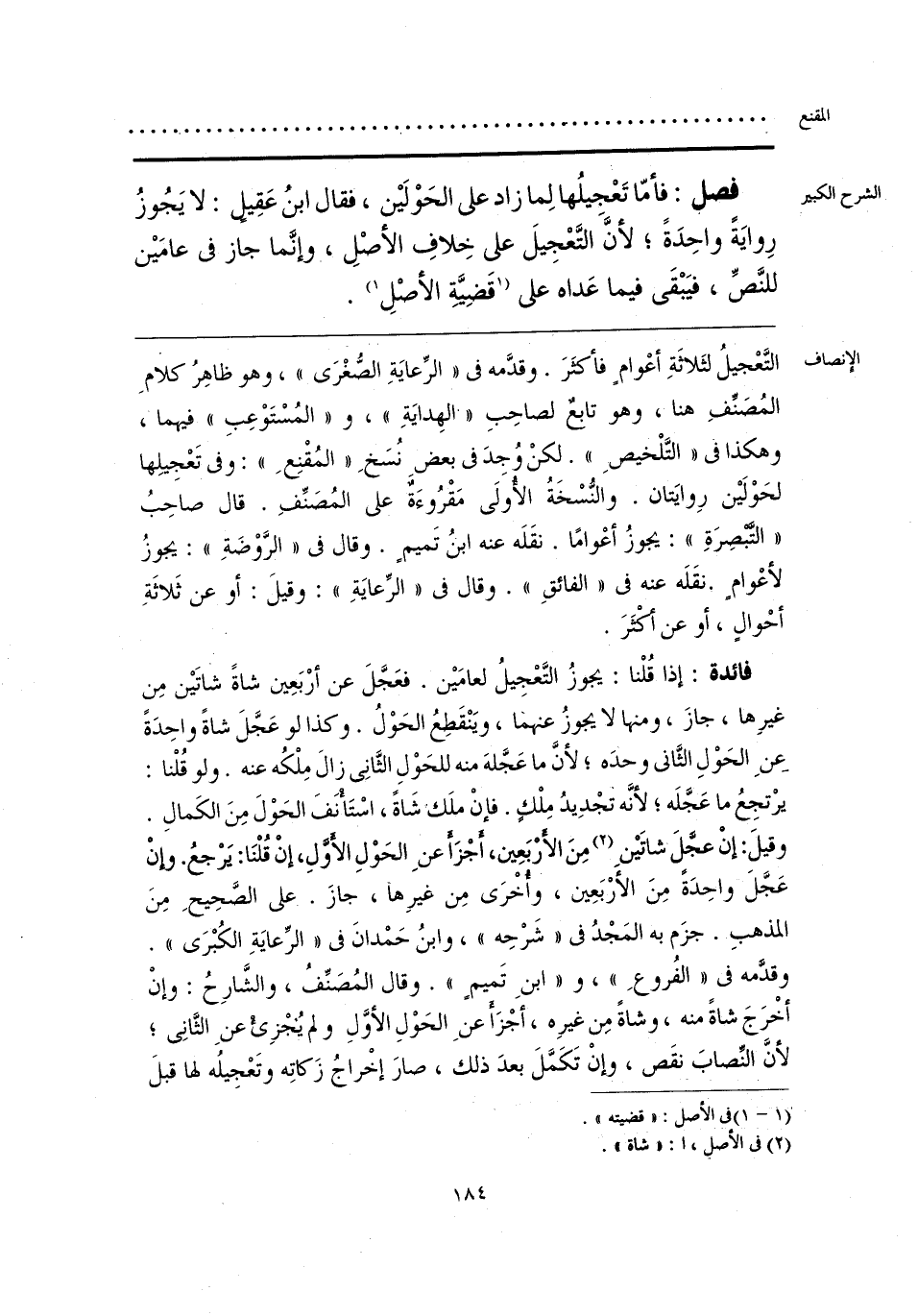 التَّعْجيلُ لثَلاثَةِ أعْوامٍ فأكثرَ. وقدَّمه فى «الرِّعايَةِ الصُّغْرَى»، وهو ظاهِرُ كلامِ المُصَنِّفِ هنا، وهو تاجٌ لصاحِبِ «الهِدايَةِ»، و «المُسْتَوْعِبِ» فيهما، وهكذا فى «التَّلْخيصِ». لكنْ وُجِدَ فى بعضِ نُسَخِ «المُقْنِعِ»: وفى تَعْجِيلِها لحَوْلَيْن رِوايَتان. والنُّسْخَةُ الأُولَى مَقْرُوءَةٌ على المُصَنِّفِ. قال صاحِبُ «التَّبْصِرَةِ»: يجوزُ أعْوامًا. نقَلَه عنه ابنُ تَميمٍ. وقال فى «الرَّوْضَةِ»: يجوزُ لأعْوامٍ. نقَلَه عنه فى «الفائقِ». وقال فى «الرِّعايَةِ»: وقيلَ: أو عن ثَلاثَةِ أحْوالٍ، أو عن أكْثَرَ.