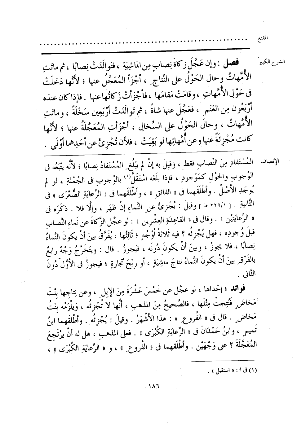 فوائد؛ إحْداها، لو عجَّل عن خَمْس عَشْرَةَ مِنَ الإِبِلِ، وعن نِتاجِها بِنْتَ مَخاضٍ فنتِجتْ مِثْلَها، فالصَّحيحُ مِنَ المذهبِ، أنَّها لا تُجْزِئُه، وَيلْزَمُه بِنْتُ مَخاضٍ. قال فى «الفُروعِ»: هذا الأشْهَرُ. وقيلَ: يُجْزِئُه. وأطْلقَهما ابن تَميمٍ، وابنُ حَمْدَانَ فى «الرِّعايَةِ الكُبْرَى». فعلى المذهبِ، هل له أنْ يرْتَجِعَ المُعجَّلَةَ؟ على وَجْهَيْن. وأطقهما فى «الفُروعِ»، و «الرِّعايَةِ الكُبْرَى»،