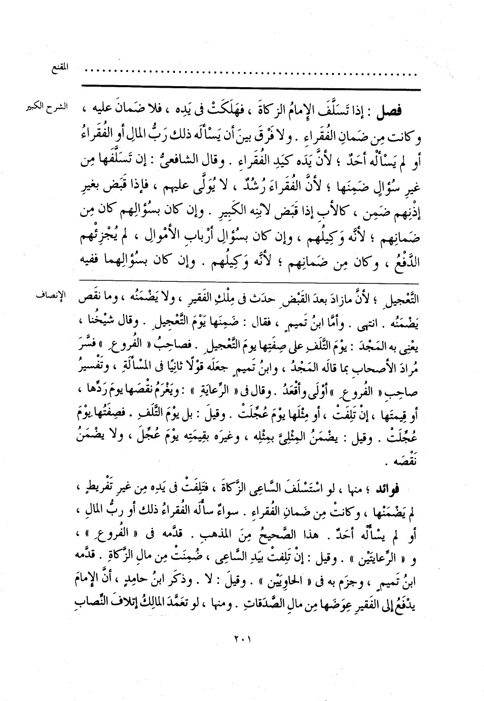 فوائد؛ منها، لو اسْتَسْلَفَ السَّاعِى الزَّكاةَ، فتَلِفَتْ فى يَدِه مِن غيرِ تَفْريطٍ، لم يَضْمَنْها، وكانتْ مِن ضَمانِ الفُقراءِ. سواء سأله الفُقراءُ ذلك أو ربُّ المالِ، أو لم يسْأَلْه أحَدٌ. هذا الصَّحيح مِنَ المذهبِ. قدَّمه فى «الفُروعِ»، و «الرِّعايتَيْن». وقيل: إنْ تَلِفتْ بيَدِ السَّاعِى، ضُمِنَتْ مِن مالِ الزَّكاةِ. قدمه ابنُ تَميمٍ، وجزَم به فى «الحاوِيَيْن». وقيلَ: لا. وذكَر ابنُ حامِدٍ، أنَّ الإِمامَ يدْفَعُ إلى الفَقيرِ عِوَضَها مِن مالِ الصَّدَقاتِ. ومنها، لو تعمَّدَ المالِكُ إتلافَ النِّصابِ