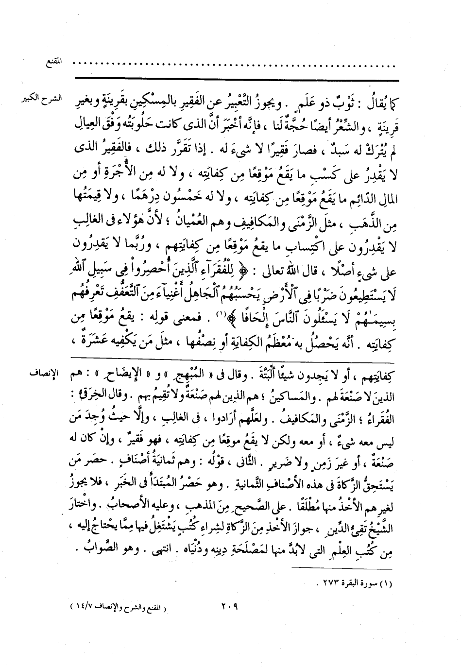 كِفايَتِهم، أو لا يَجِدون شيئًا ألْبَتَّةَ. وقال فى «المُبْهِجِ» و «الإِيضَاحِ»: هم الذينَ لا صَنْعَةَ لهم. والمَساكينُ؛ هم الذِين لهم صَنْعَةٌ ولا تُقِيمُ بهم. وقال الخِرَقىُّ: الفُقَراءُ؛ الزَّمْنَى والمَكافيفُ. ولعَلَّهم أرَادوا، فى الغالِبِ، وإلَّا حيثُ وُجِدَ مَن ليس معه شئٌ، أو معه ولكن لا يقَعُ موقِعًا مِن كِفايته، فهو فَقيرٌ، وإنْ كان له صَنْعَةٌ، أو غيرَ زَمِنٍ ولا ضَريرٍ. الثَّانى، قوْلُه: وهم ثَمانيَةُ أصْنَافٍ. حصَر مَن يَسْتَحِقُّ الزَّكاةَ فى هذه الأصْنافِ الثَّمانيةِ. وهو حَصْرُ المُبتَدَأ فى الخَبَرِ، فلا يجوزُ لغيرِهم الأخْذُ منها مُطْلَقًا. على الصَّحيحِ مِنَ المذهبِ، وعليه الأصحابُ. واخْتارَ الشَّيْخُ تَقِىُّ الدِّينِ، جوازَ الأخْذِ مِنَ الزَّكاةِ لشِراءِ كُتُبٍ يَشْتَغِلُ فيها مِمَّا يحْتاجُ إليه، مِن كُتُبِ العِلْم التى لابُدَّ منها لمَصْلَحَةِ دِينه ودُنْيَاه. انتهى. وهو الصَّوابُ.