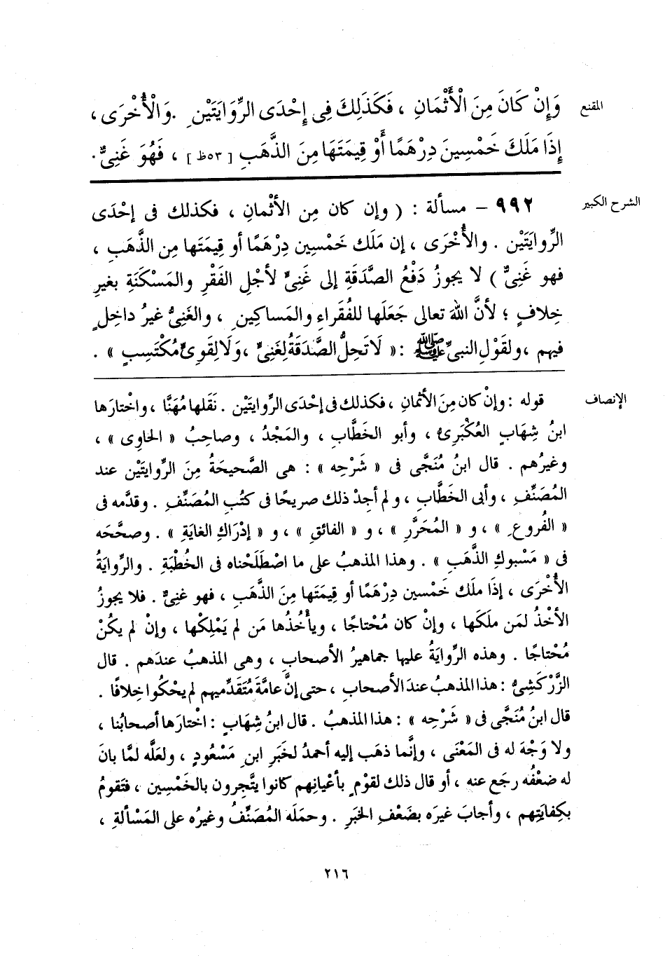 قوله: وإنْ كان مِنَ الأثمانِ، فكذلك فى إحْدَى الرِّوايتَيْن. نَقَلها مُهَنَّا، واخْتارَها ابنُ شِهَابٍ العُكبَرِىُّ، وأبو الخَطَّابِ، والمَجْدُ، وصاحِبُ «الحاوِى»، وغيرُهم. قال ابنُ مُنَجَّى فى «شَرْحِه»: هى الصَّحيحَةُ مِنَ الرِّوايتَيْن عند المُصَنِّفِ، وأبى الخَطَّابِ، ولم أجِدْ ذلك صريحًا فى كتُبِ المُصَنِّف. وقدَّمه فى «الفُروعِ»، و «المُحَرَّرِ»، و «الفائقِ»، و «إدْرَاكِ الغايَةِ». وصحَّحَه فى «مَسْبوكِ الذَّهَبِ». وهذا المذهبُ على ما اصْطَلَحْناه فى الخُطْبَةِ. والرِّوايَة الأُخْرَى، إذَا ملَك خَمْسين دِرْهَمًا أو قِيمَتَها مِنَ الذَّهَبِ، فهو غنِىٌّ. فلا يجوزُ الأخْذُ لمَن ملَكَها، وإنْ كان محْتاجًا، ويأْخُذُها مَن لم يَمْلِكْها، وإنْ لم يكُنْ مُحْتاجًا. وهذه الرِّوايَةُ عليها جماهيرُ الأصحابِ، وهى المذهبُ عندَهم. قال الزَّرْكَشِىُّ: هذا المذهبُ عندَ الأصحابِ، حتى إنَّ عامَّةَ مُتَقَدِّميهم لم يحْكُوا خِلافًا. قال ابنُ منَجَّى فى «شَرْحِه»: هذا المذهبُ. قال ابنُ شِهَابٍ: اخْتارَها أصحابُنا، ولا وَجْهَ له فى المَعْنَى، وإنما ذهَب إليه أحمدُ لخَبَرِ ابنِ مَسْعُودٍ، ولعَلَّه لمَّا بانَ له ضعْفُه رجَع عنه، أو قال ذلك لقوْمٍ بأعْيانِهم كانوا يتَّجِرون بالخَمْسِينْ، فتَقومُ بكِفايَتِهم، وأجابَ غيرَه بضَعْفِ الخَبرِ. وحمَلَه المُصَنِّفُ وغيرُه على المَسْألةِ،