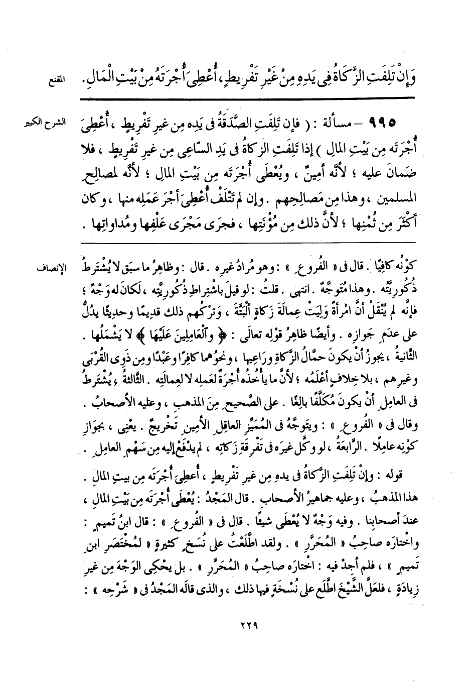 قوله: وإنْ تَلِفَتِ الزكاةُ فى يدهِ مِن غيرِ تَفْرِيطٍ، أُعطِىَ أُجْرَتَه مِن بيتِ المالِ. هذا المذهبُ، وعليه جماهيرُ الأصحابِ. قال المَجْدُ: يُعْطَى أُجْرَتَه مِن بَيْتِ المالِ، عندَ أصحابِنا. وفيه وَجْهٌ لا يُعْطَى شيئًا. قال فى «الفُروعِ»: قال ابنُ تَميمٍ: واخْتارَه صاحِبُ «المُحَرَّرِ». ولقد اطَّلَعْتُ على نُسَخٍ كثيرةٍ «لمُخْتَصَرِ ابنِ تَميمٍ»، فلم أجدْ فيه: اخْتارَه صاحِبُ «المُحَرَّرِ». بل يحْكِى الوَجْهَ مِن غيرِ زِيادَةٍ، فلعَلَّ الشَيْخَ اطَّلَع على نُسْخَةٍ فيها ذلك، والذي قالَه المَجْدُ فى «شَرْحِهِ»: